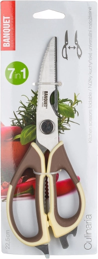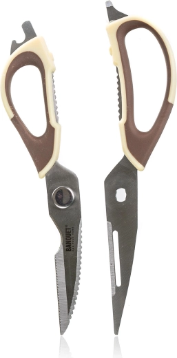 Praktiske, universelle køkkensakse på 22,5 cm med mulighed for at adskille delene for nem rengøring og alsidig anvendelse. De har skarpe blade i rustfrit stål, ergonomiske beige‑brune håndtag og integrerede værktøjer til at åbne flasker, knække nødder samt klippe fjerkræ.