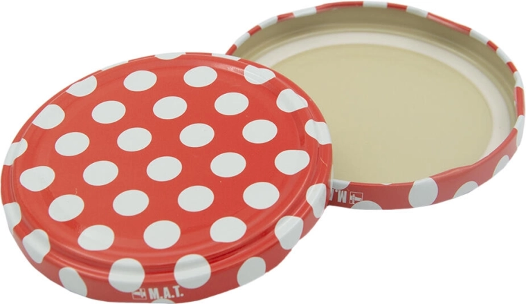 Praktisk sæt konserveringslåg med en diameter på 82 mm med prikket dekoration til glas med RSB-gevind. Ideelle til hjemmekonservering og langtidsopbevaring af fødevarer. Pålidelig tætning, skruelåg og universel diameter 82 mm sikrer sikker og bekvem anvendelse.