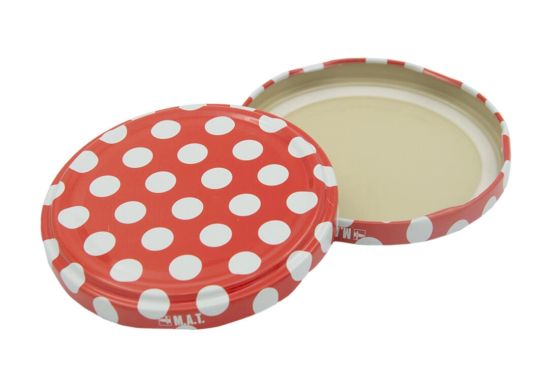 Leder du efter pålidelige låg til dine sylteglas? Disse Twist 82-låg med den populære prikkede dekoration tilbyder sikker lukning takket være RSB-skruelågssystemet og er et fremragende valg til hjemme- og sæsonkonservering af frugt, grøntsager eller marmelader.