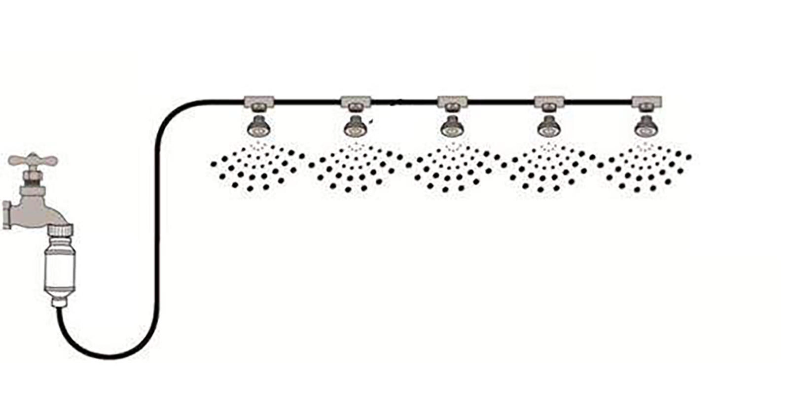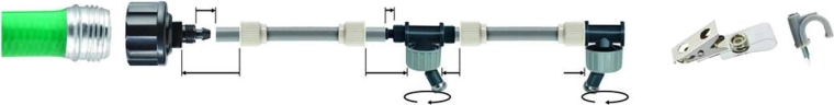 Tilslut til udendørs vandhane, rul 7,5 m slange ud og placer 5 dyser med de medfølgende clips. Færdig på få minutter.