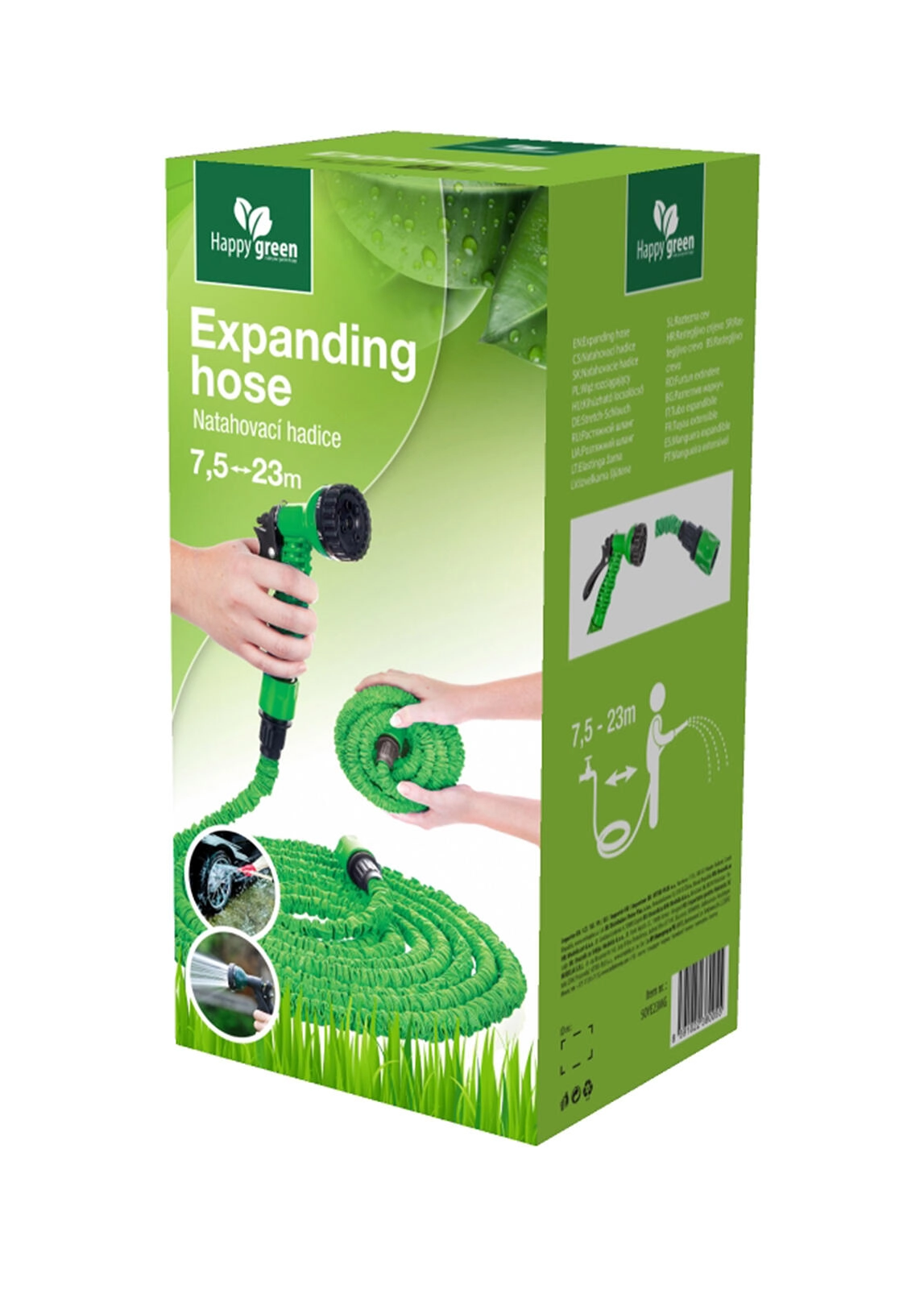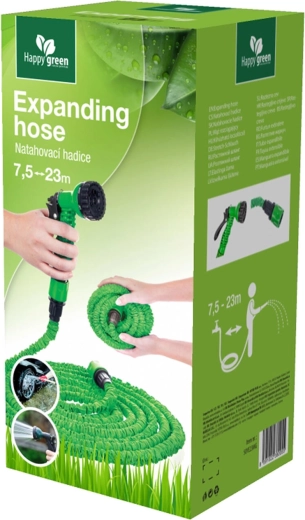 Praktisk havevandslange med en maksimal længde på 23 m og en diameter på 1/2", som automatisk udvider sig til næsten tredobbelt af sin oprindelige længde, når den fyldes med vand. Inkluderer en multifunktions-spraypistol og et holdbart design i grøn farve for nem havepleje uden sammenfiltring.