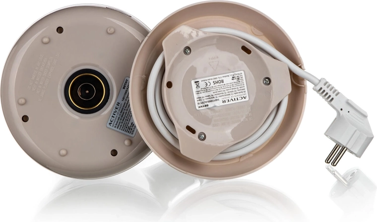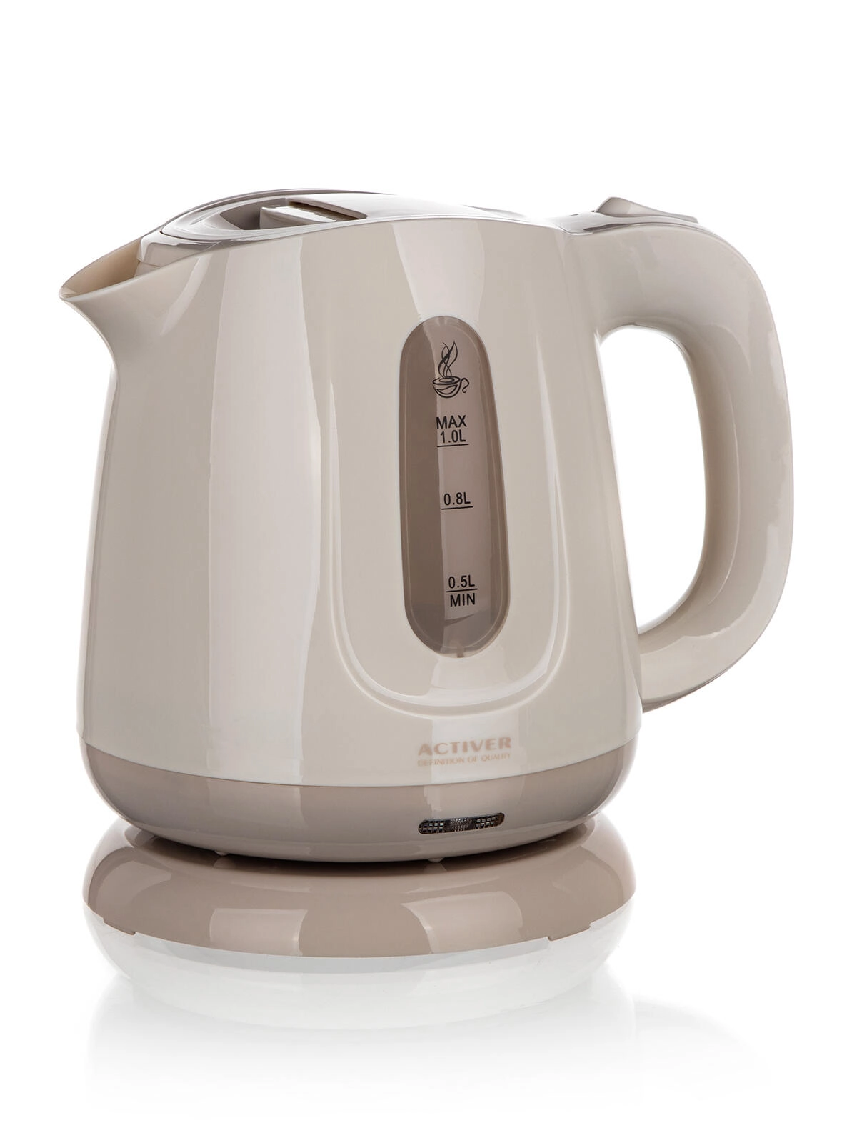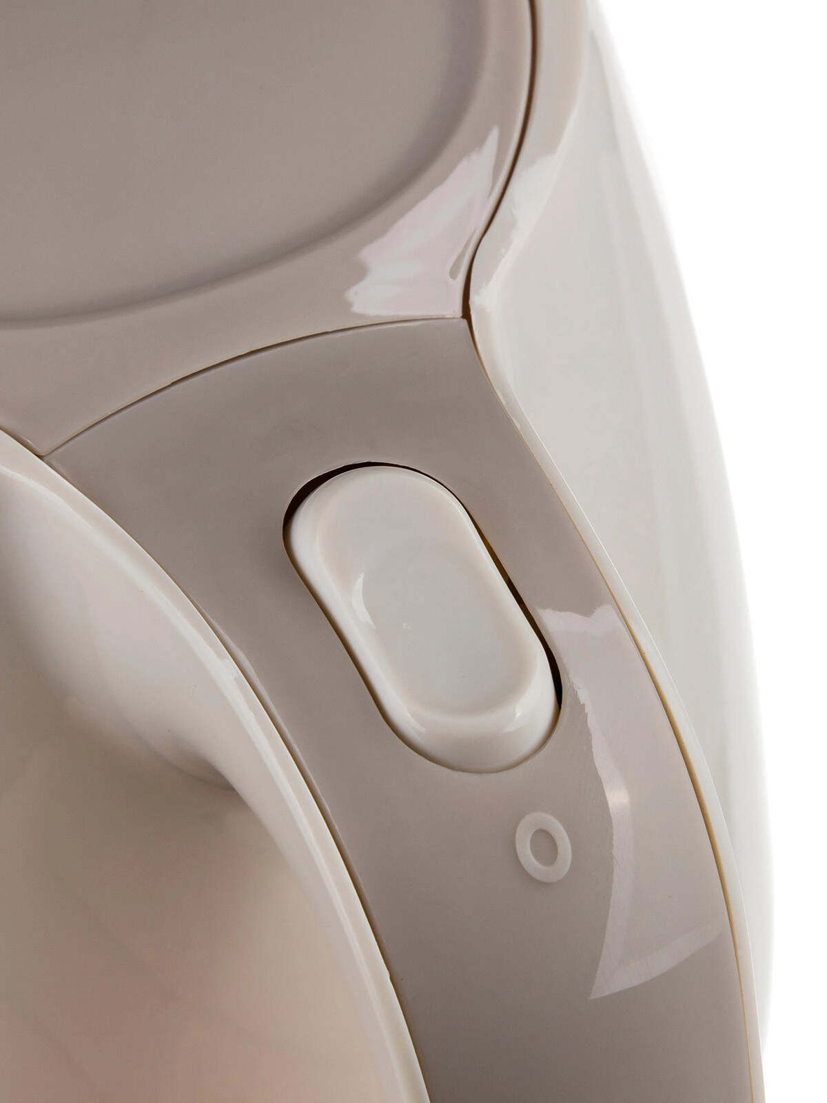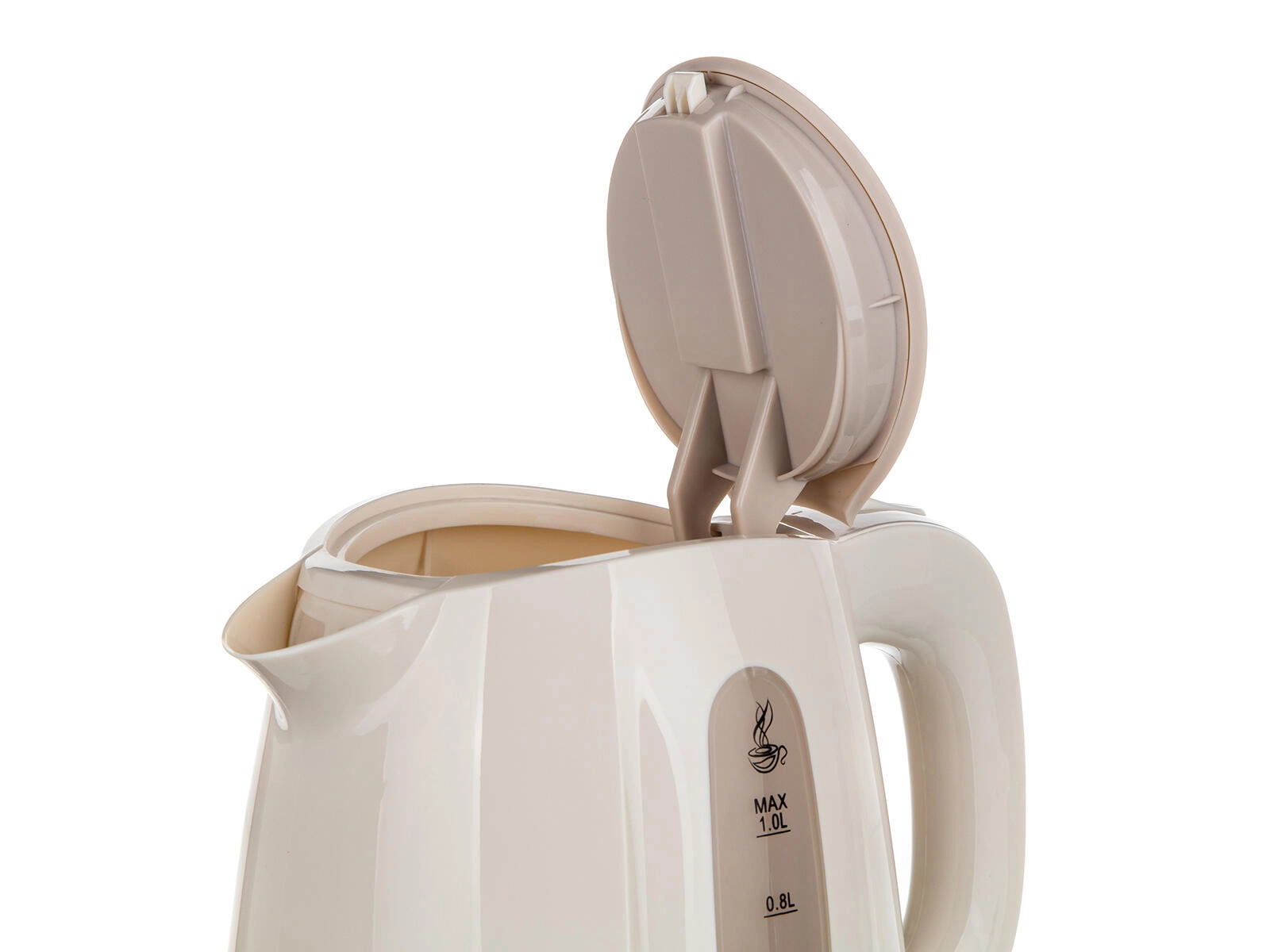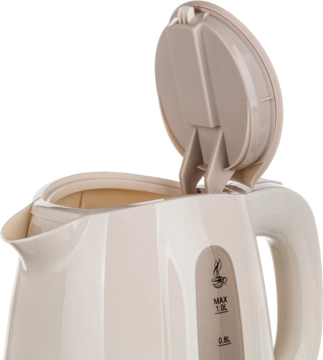 Den stilfulde elkedel i plast i farvekombinationen hvid–mokka passer perfekt ind i det moderne hjem. Takket være den flade bund i rustfrit stål opvarmer den vandet effektivt og er let at rengøre. Den kompakte kapacitet på 1 liter er ideel til hurtig kaffe, te og mindre husholdninger.
