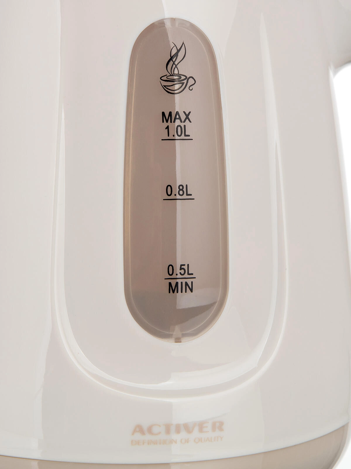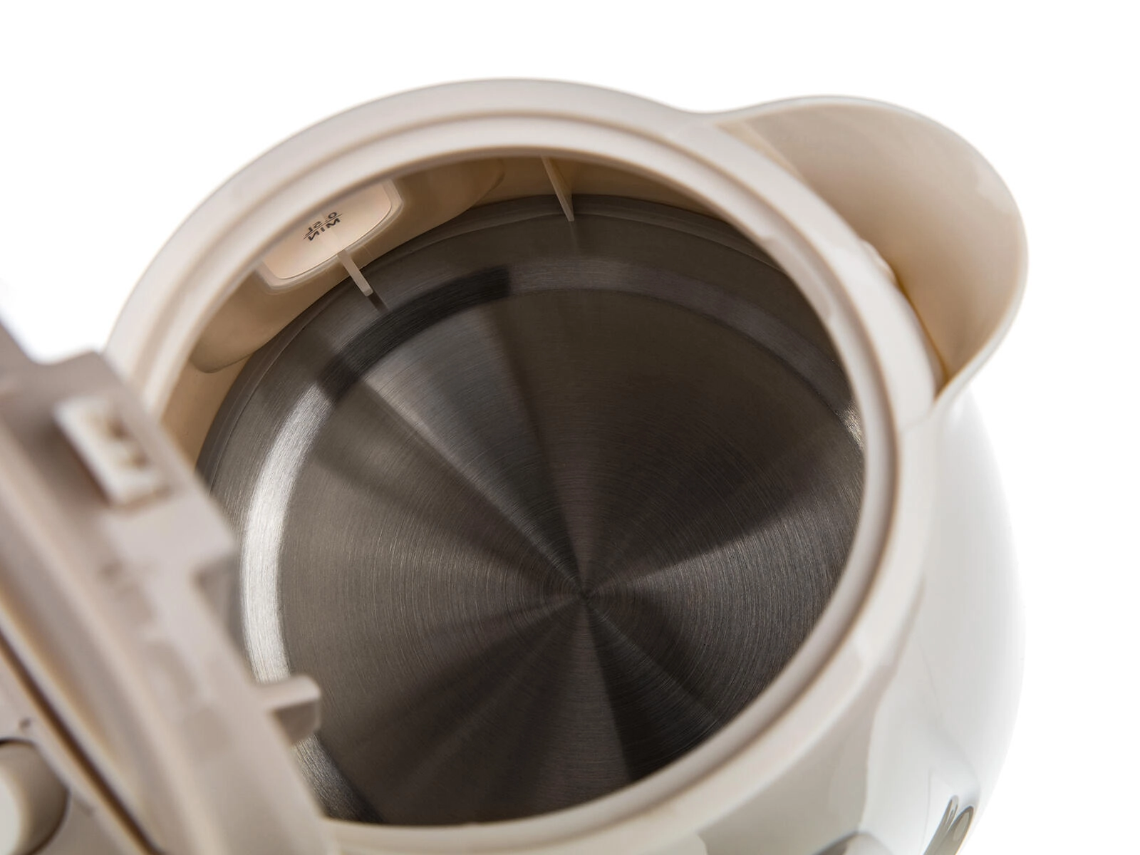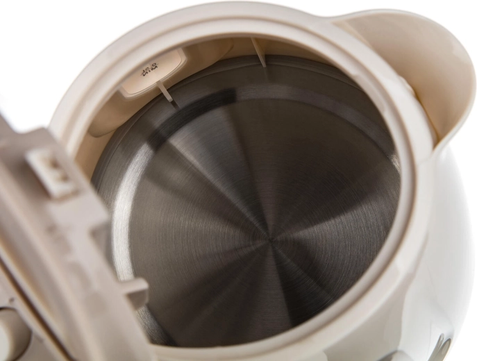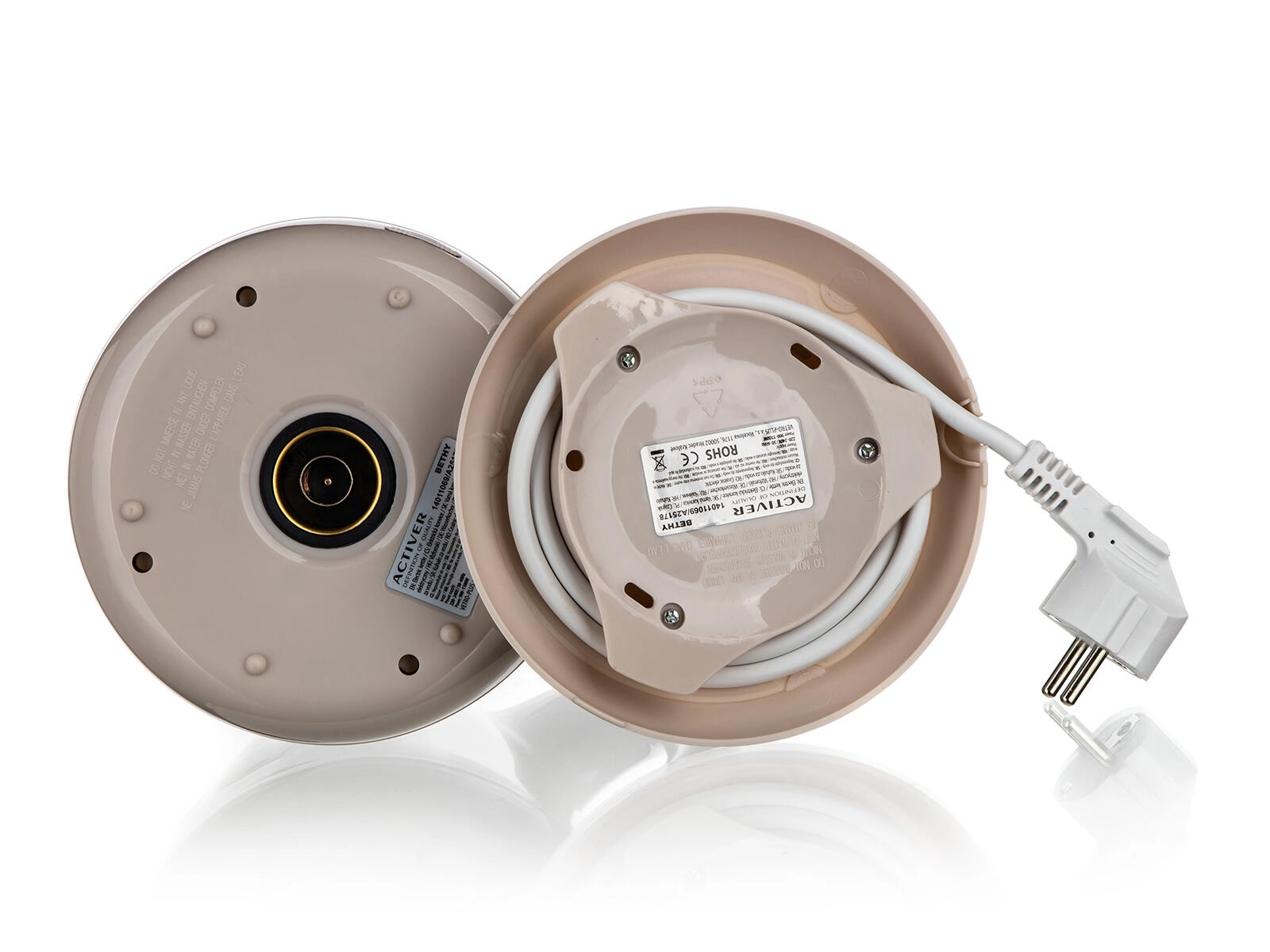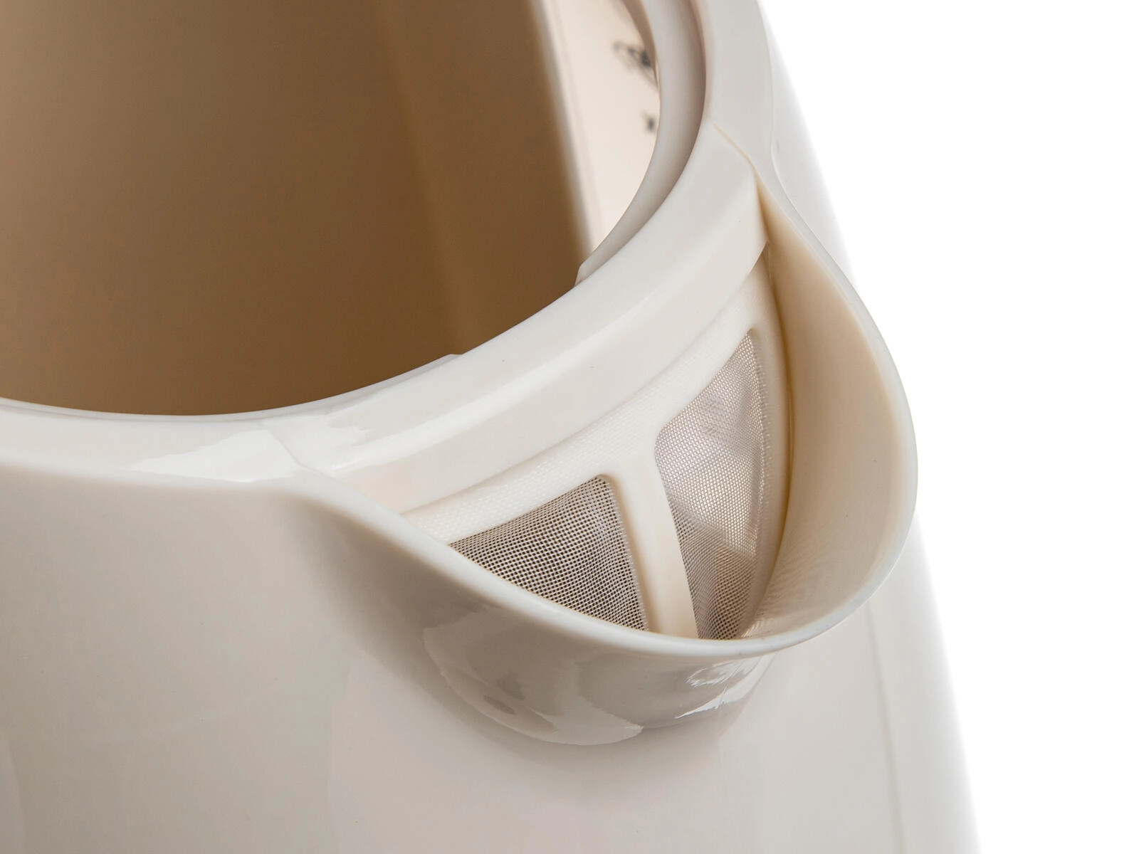 Den stilfulde elkedel i plast i farvekombinationen hvid–mokka passer perfekt ind i det moderne hjem. Takket være den flade bund i rustfrit stål opvarmer den vandet effektivt og er let at rengøre. Den kompakte kapacitet på 1 liter er ideel til hurtig kaffe, te og mindre husholdninger.