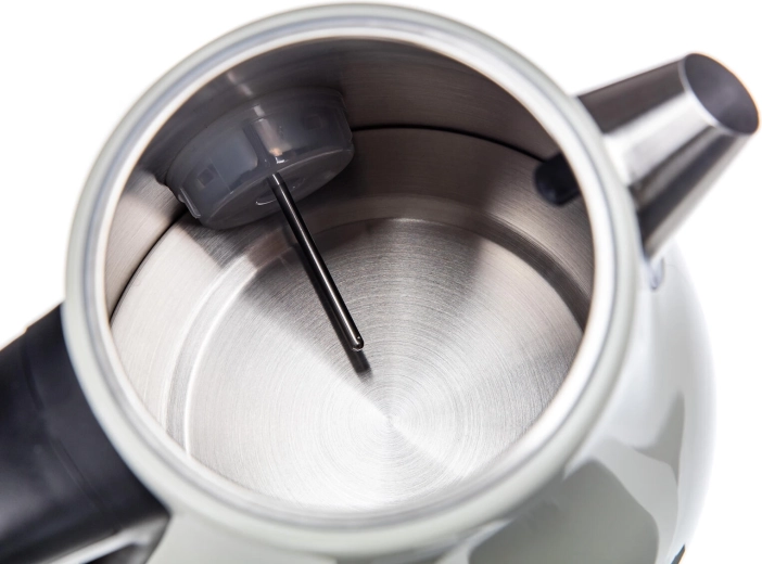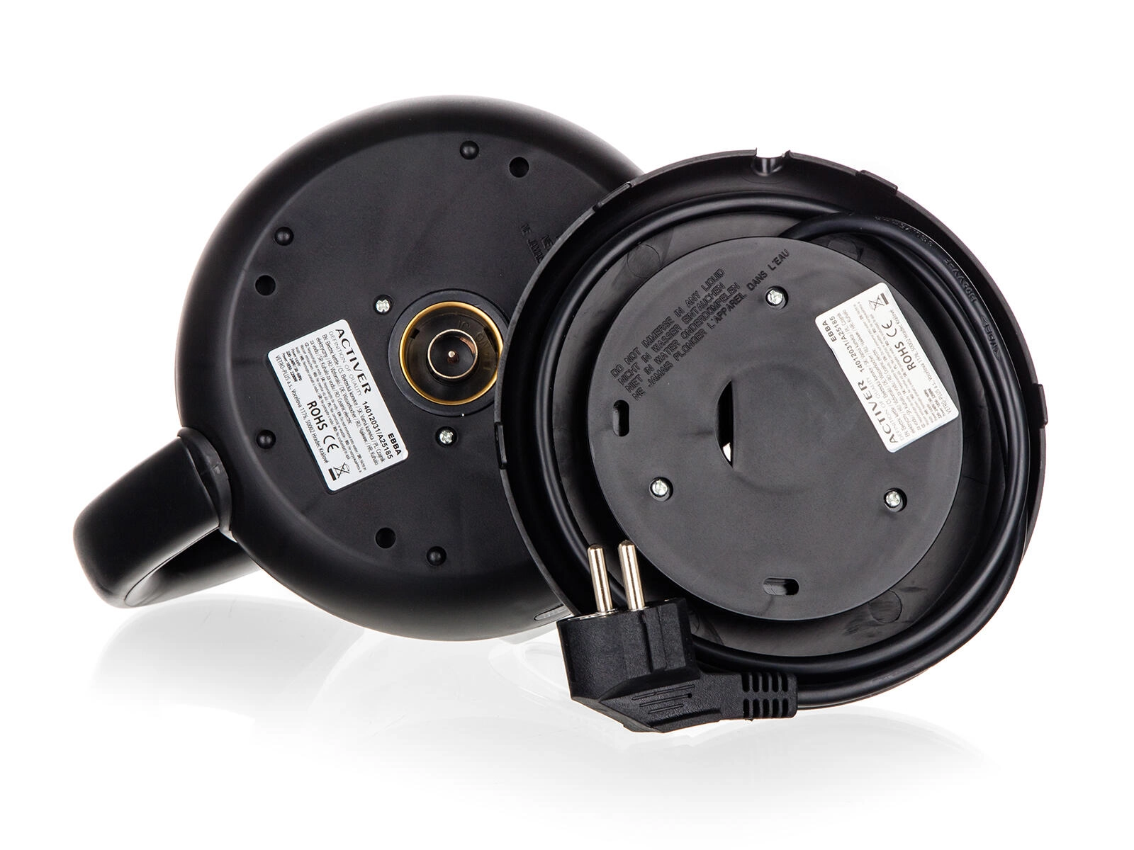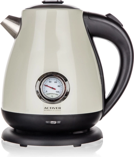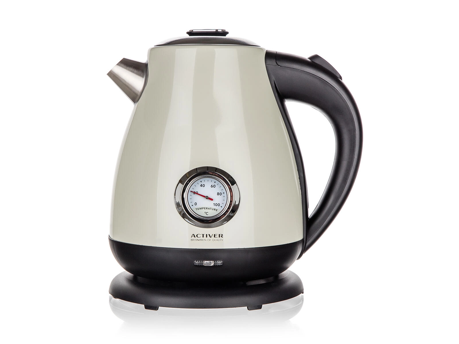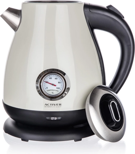 Den elegante EBBA‑kedel med dobbeltvægget kabinet i rustfrit stål i sort‑hvid bliver en pålidelig hjælper i ethvert køkken. Takket være effekten på 1850–2200 W varmer den vand på et øjeblik, og det integrerede analoge termometer lader dig overvåge temperaturen til te, kaffe eller andre drikke.
