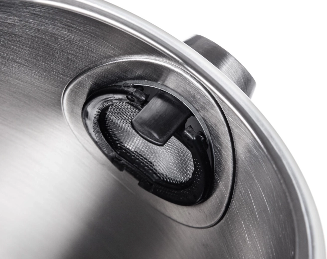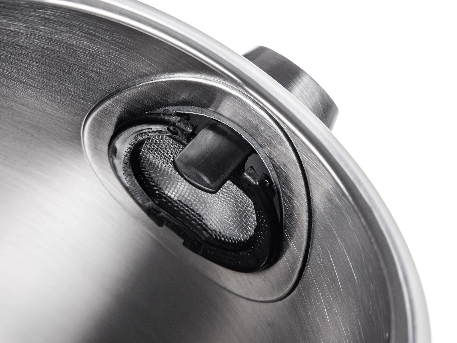 For sikker og bekvem brug er den udstyret med overophedningsbeskyttelse, automatisk og manuel slukning samt en 360° drejesokkel med centralkonnektor. Det praktiske indbyggede filter opfanger grove urenheder, og udførelsen i rustfrit stål gør rengøringen lettere og forlænger levetiden.