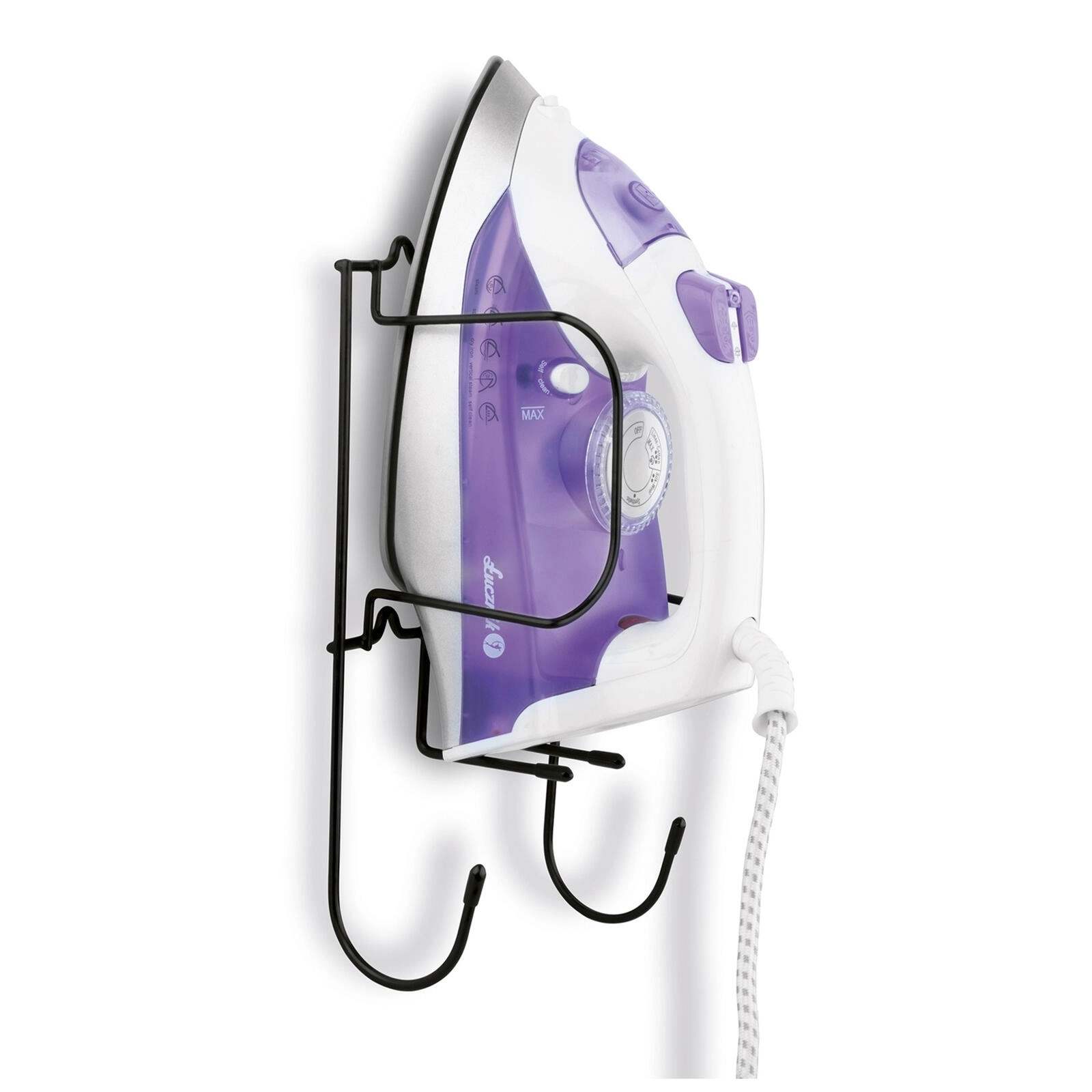 Den øverste holder fikserer strygejernet sikkert, og de nederste kroge bruges til at hænge strygebrættet eller rulle kablet op for maksimal orden.