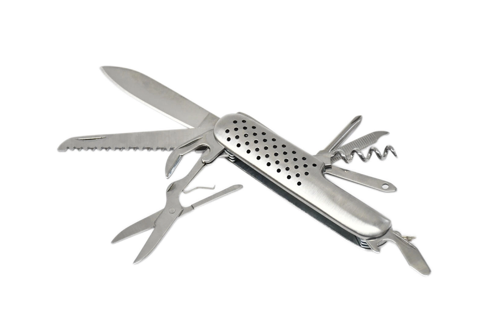 - Hovedkniv, saks, træsav, dåseåbner, proptrækker (vinåbner), flaskeåbner, stjerneskruetrækker, stålfil, værktøj til at træde en nål