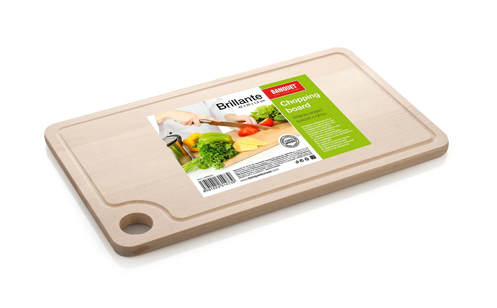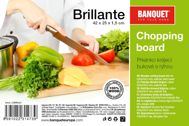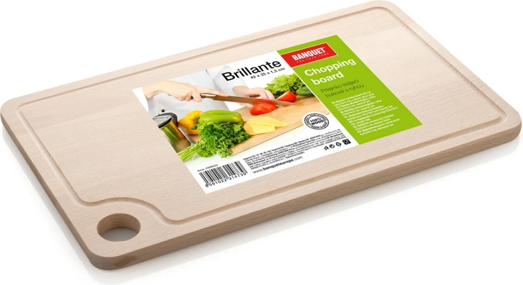 Praktisk træskærebræt BANQUET BRILLANTE i størrelsen 42 × 25 cm af bøgetræ byder på kvalitetsforarbejdning og en omløbende rille til opsamling af safter. Ideelt til daglig skæring og servering med et naturligt udseende og lang levetid.