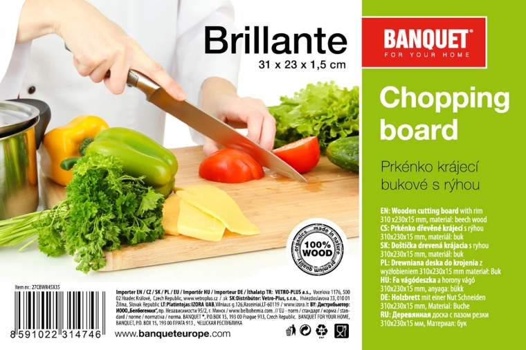 Målet 31 × 23 × 1,5 cm er ideelt til daglig skæring, hakning og servering. Den glatte overflade gør vedligeholdelsen nem og er skånsom mod knivenes æg.