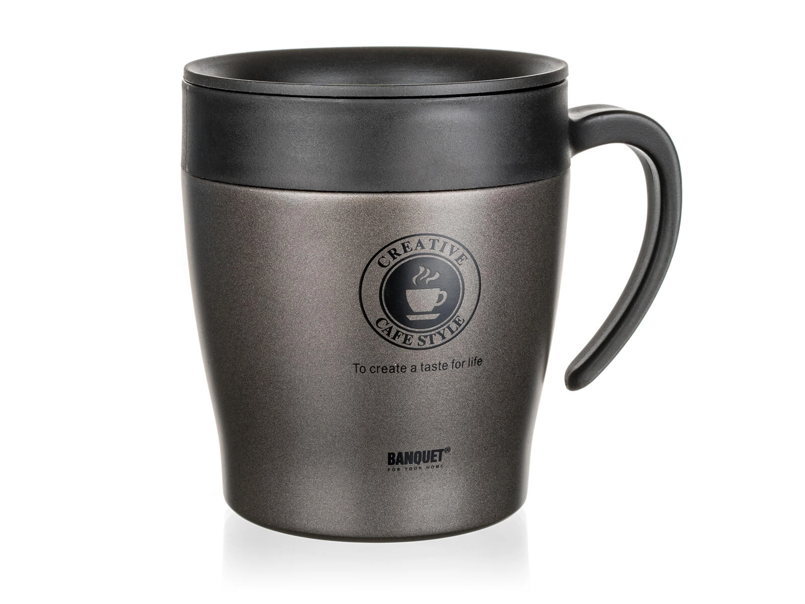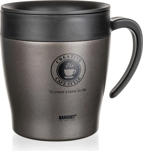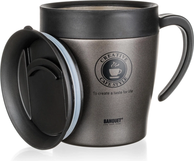 Rejs med din yndlingsdrik i stil og komfort. Termokoppen TAZZA med en kapacitet på 330 ml kombinerer moderne antracitmetallic med et praktisk design – vakuum-dobbeltvægget konstruktion holder kaffe eller te varm længere og læskedrikke behageligt kolde. Det holdbare rustfri stål 201 udvendigt og det hygiejniske rustfri stål 304 indvendigt er lette at vedligeholde og modstår daglig brug.