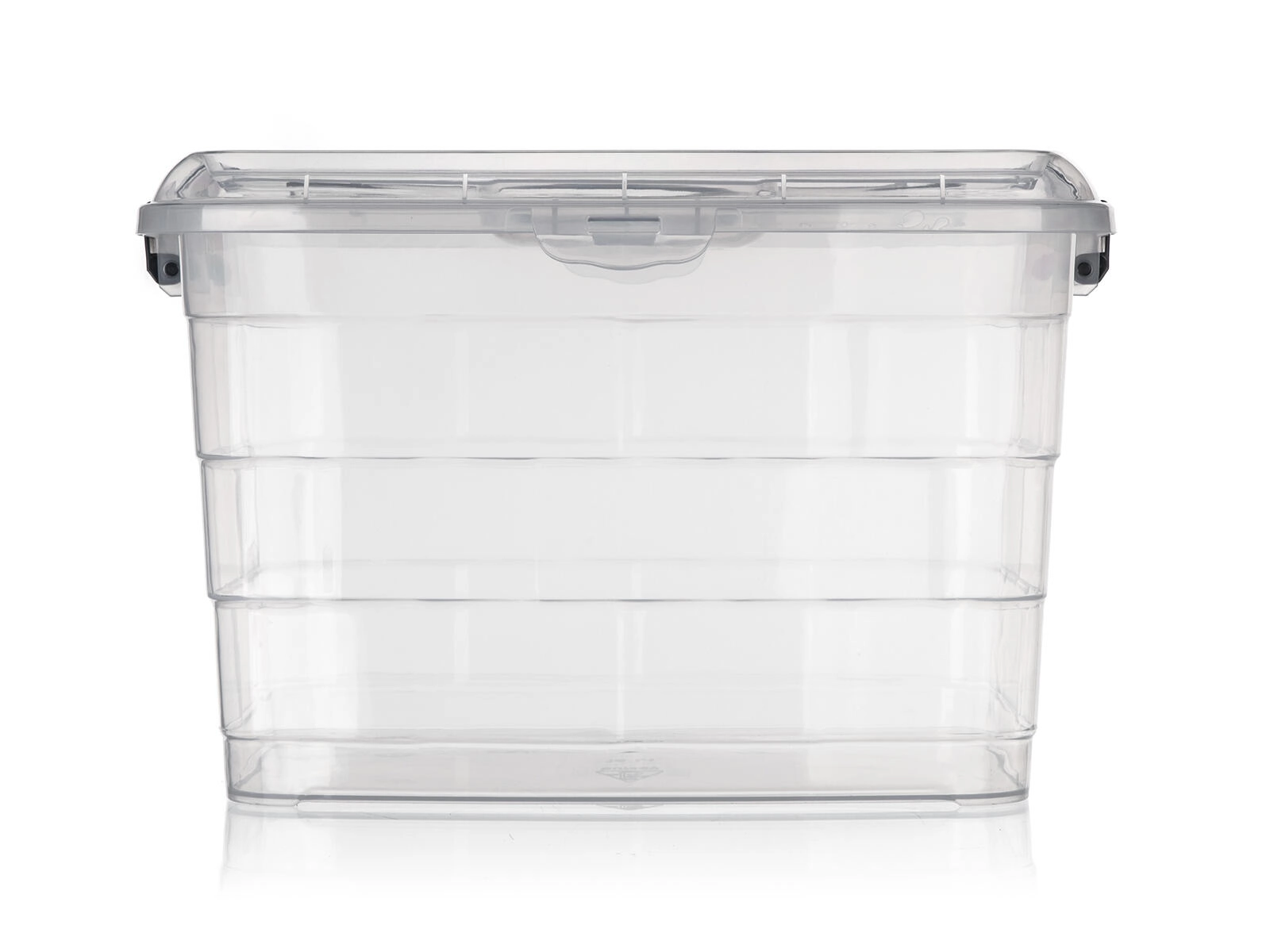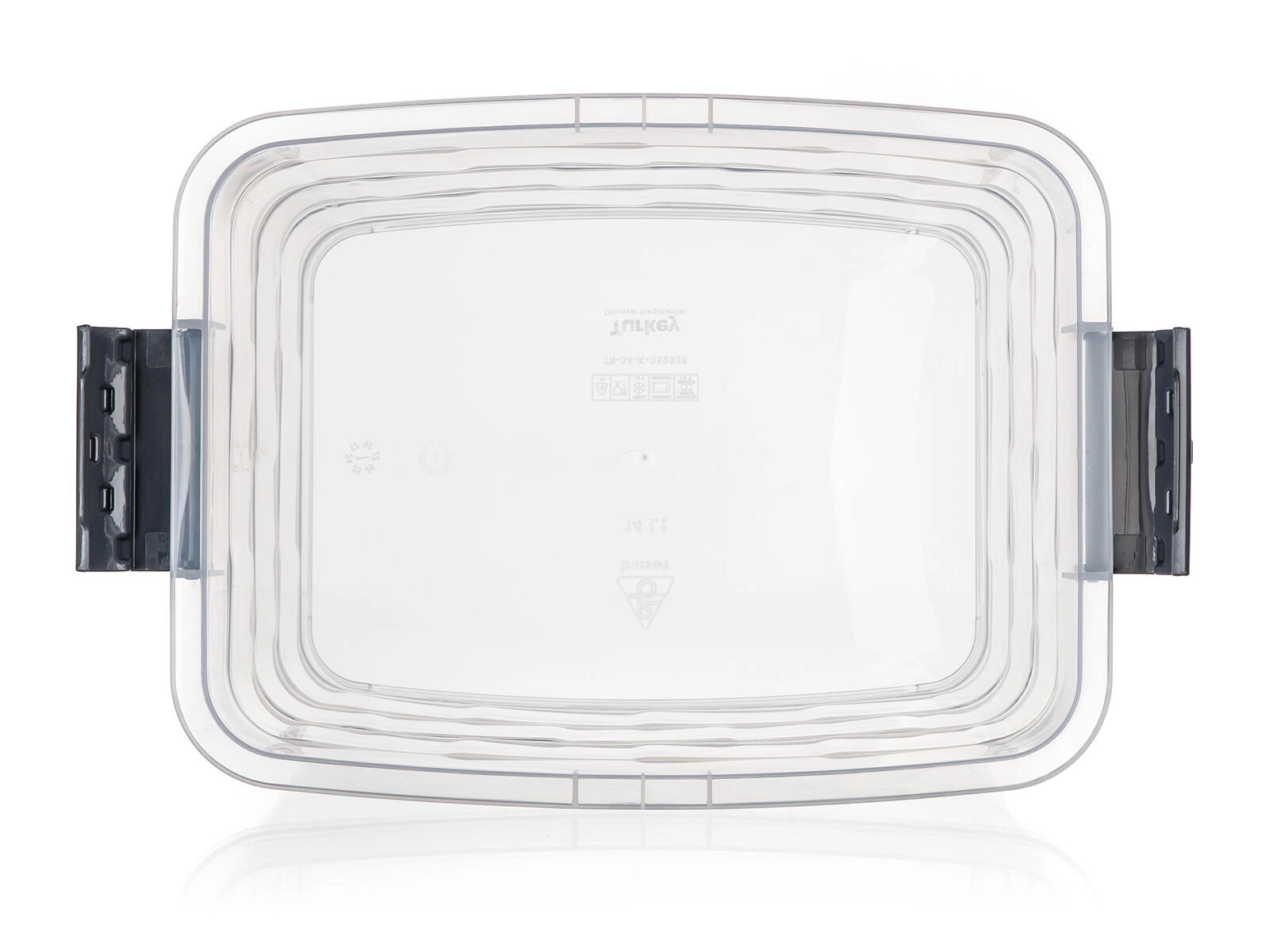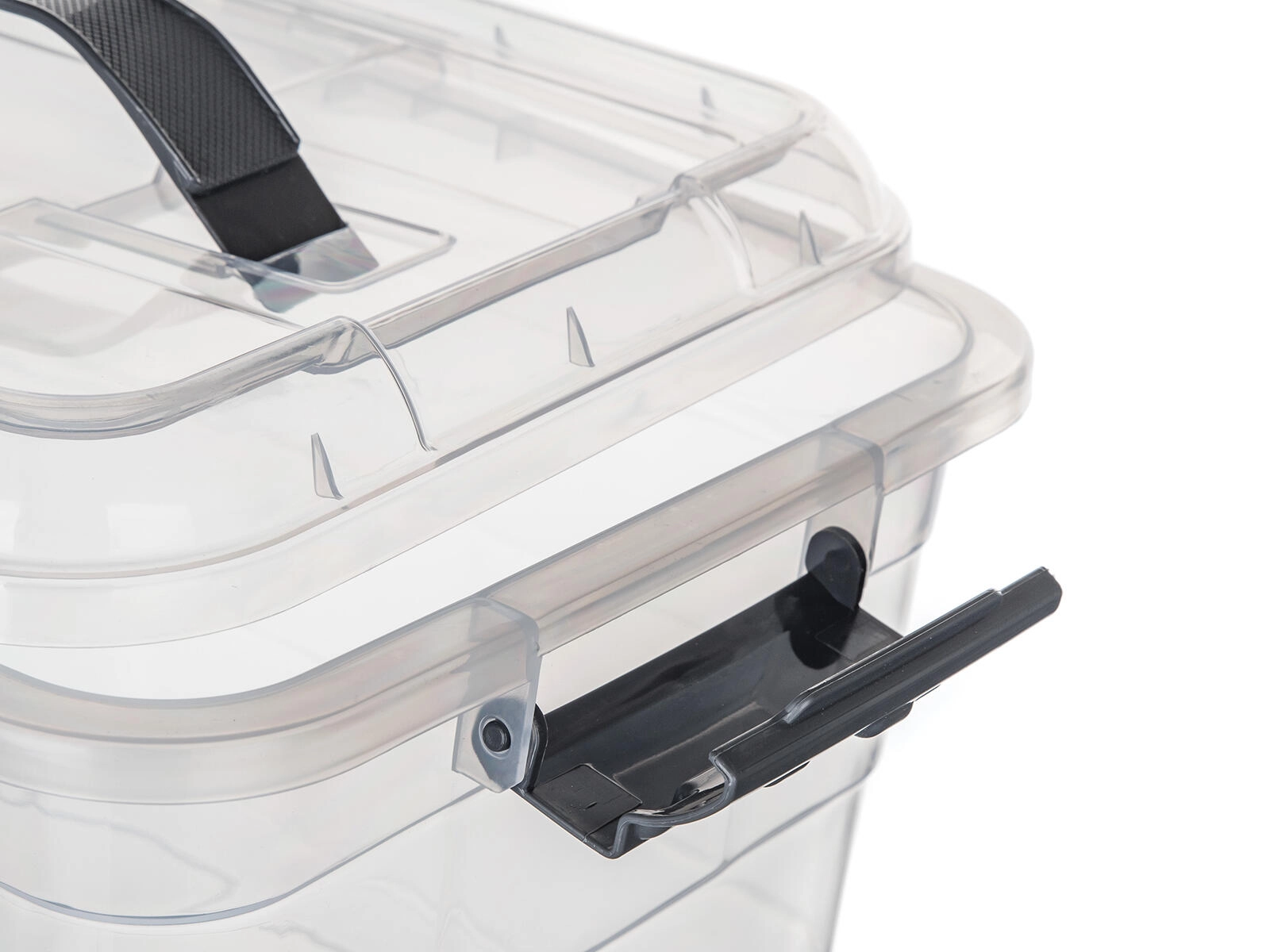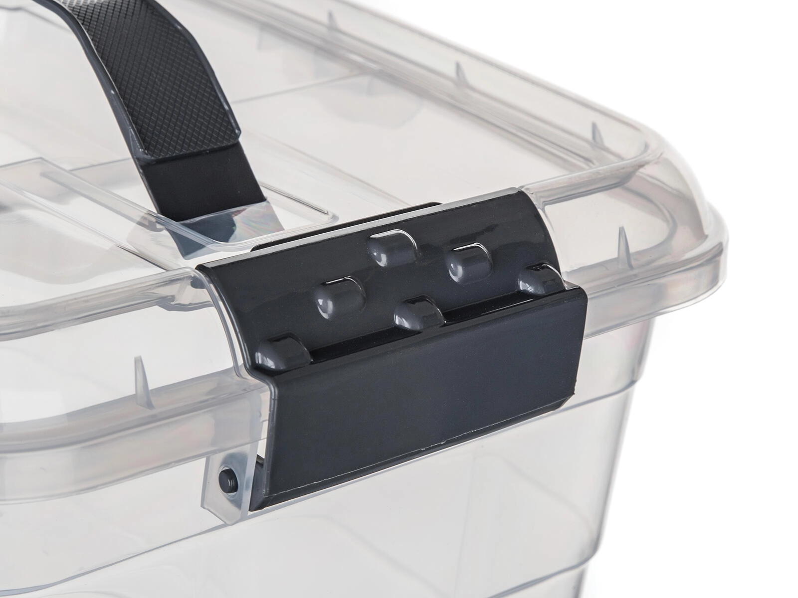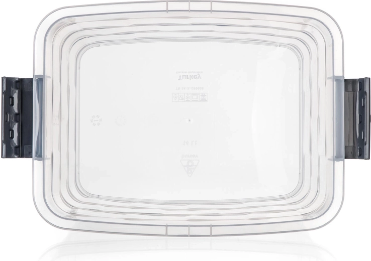 Sideklips i røgfarvet udførelse sikrer, at låget lukker pålideligt, så indholdet ikke falder ud under transport og forbliver beskyttet mod støv.