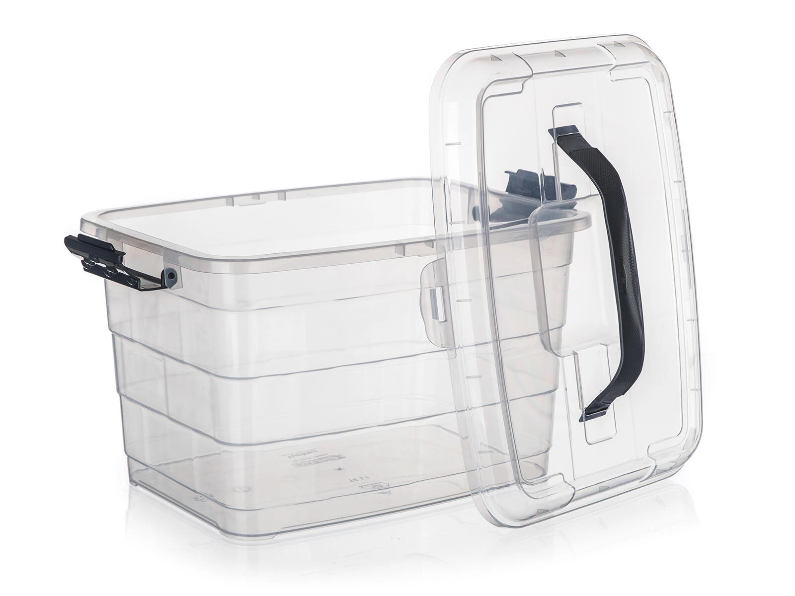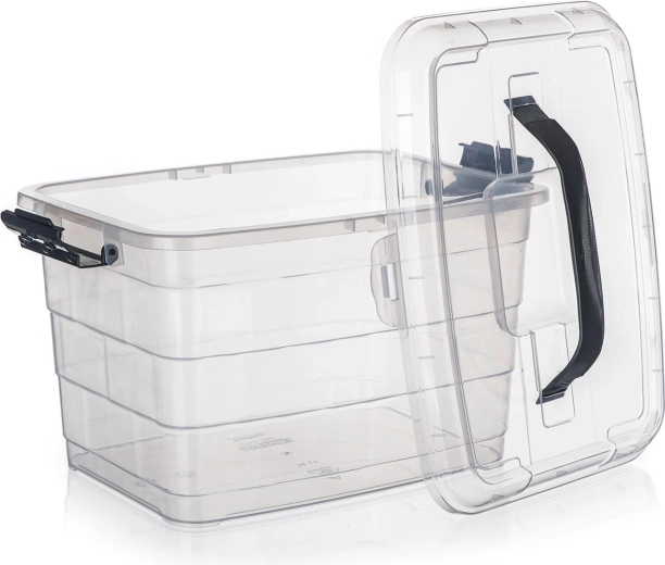 Hold orden derhjemme og på kontoret. VILARD opbevaringsboks med 14 liters volumen kombinerer gennemsigtige sider for øjeblikkeligt overblik, robust konstruktion og sikker lukning med stærke sideklips. Det integrerede håndtag i låget gør håndtering og transport lettere.