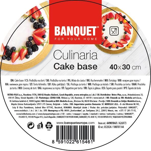 Brug det til arbejde med bunde, den endelige dekoration samt servering og transport af færdige kager. Den robuste overflade forhindrer indtrængning af fugt og fedt, så underlaget forbliver rent og præsentabelt.