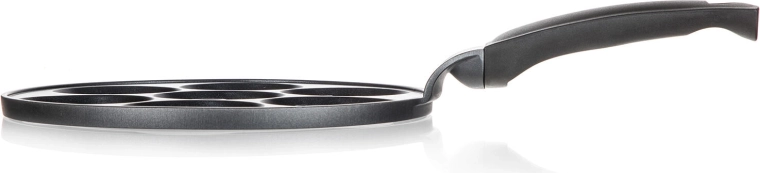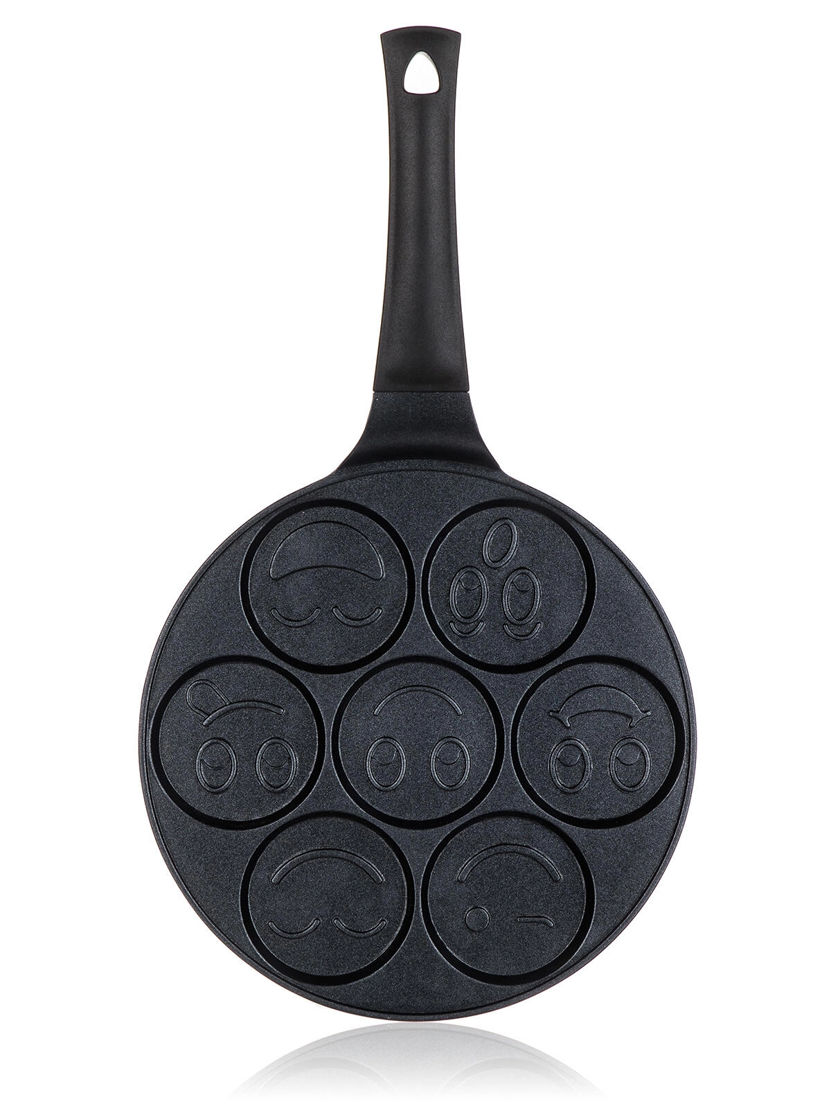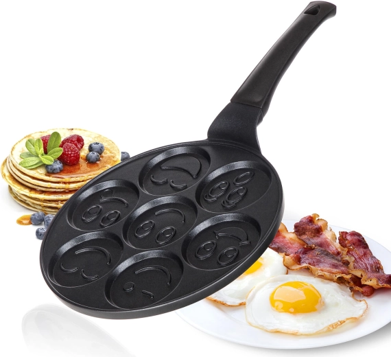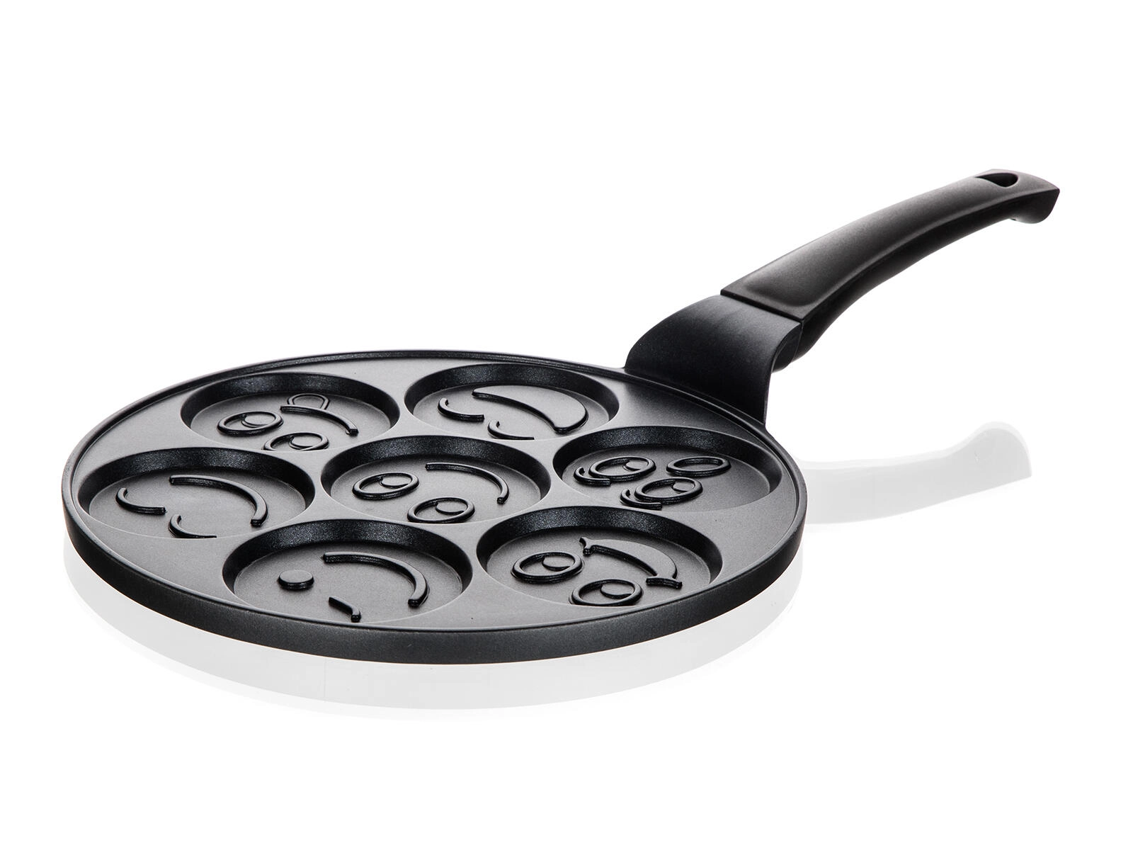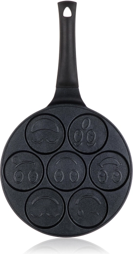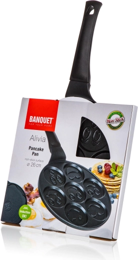 Pandekagepanden ALIVIA Smile forvandler enhver morgenmad til sjov. Syv runde fordybninger med en diameter på 8 cm og reliefmotiver sikrer perfekt formede pandekager og æg med smil. Støbt aluminium garanterer hurtig og jævn opvarmning, mens den kvalitetsrige nonstick-overflade gør både vending og rengøring nemmere.