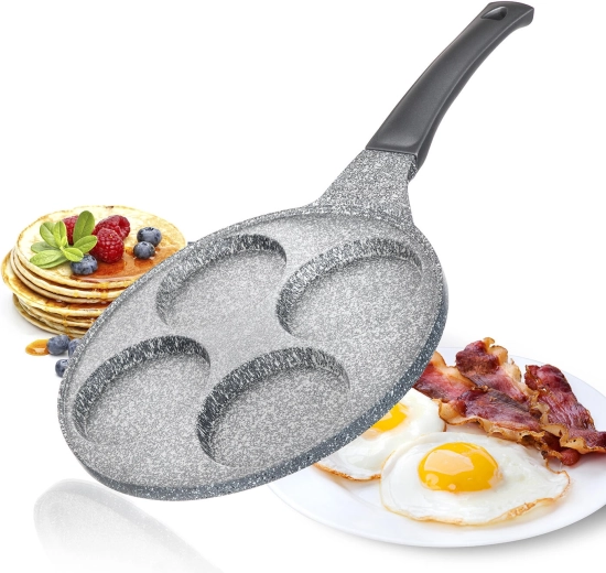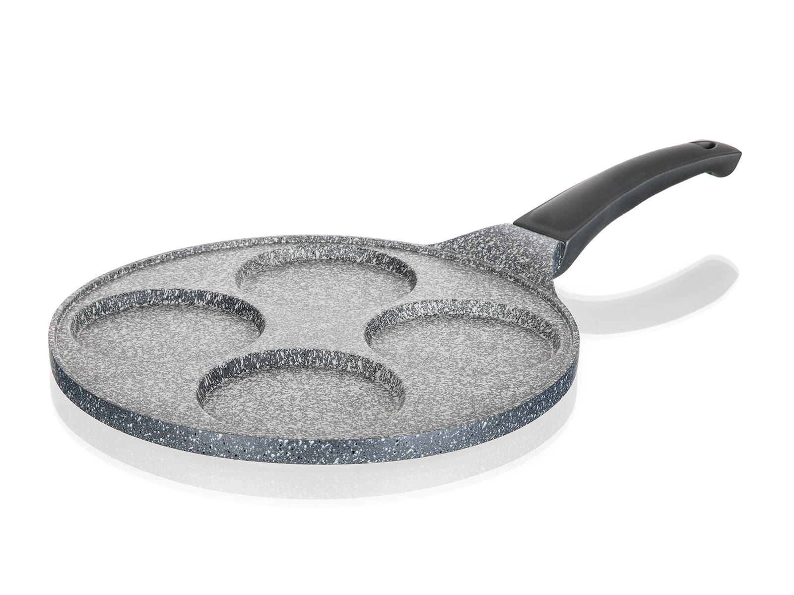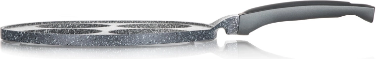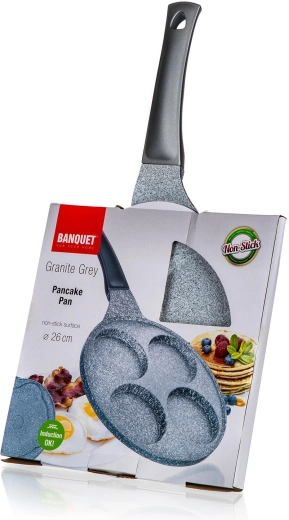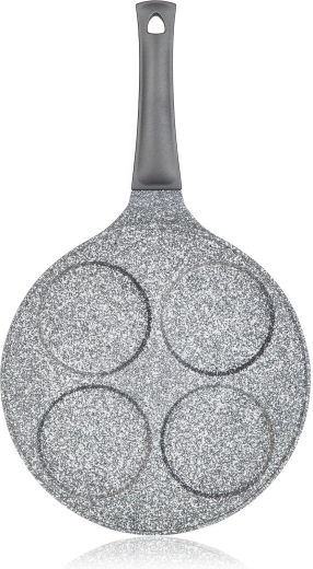 Støbt aluminiums pandekagepande med GRANITE Grey-overflade er et fremragende valg til daglige morgenmåltider og hurtige snacks. Fire dedikerede forme sikrer ensartet form og gennemstegning af pandekager, spejlæg eller kartoffelpandekager – med minimal brug af olie takket være den meget nonstick-overflade.