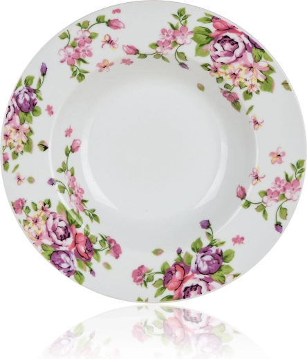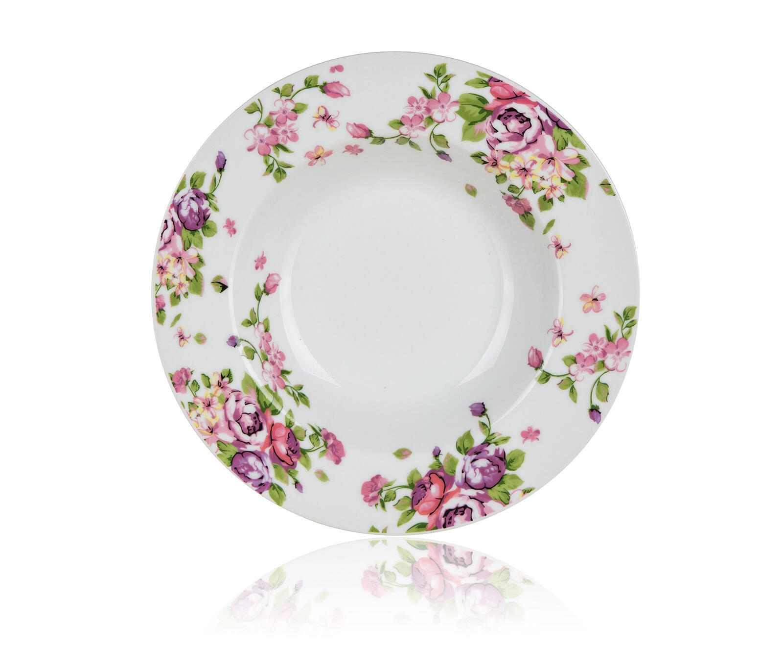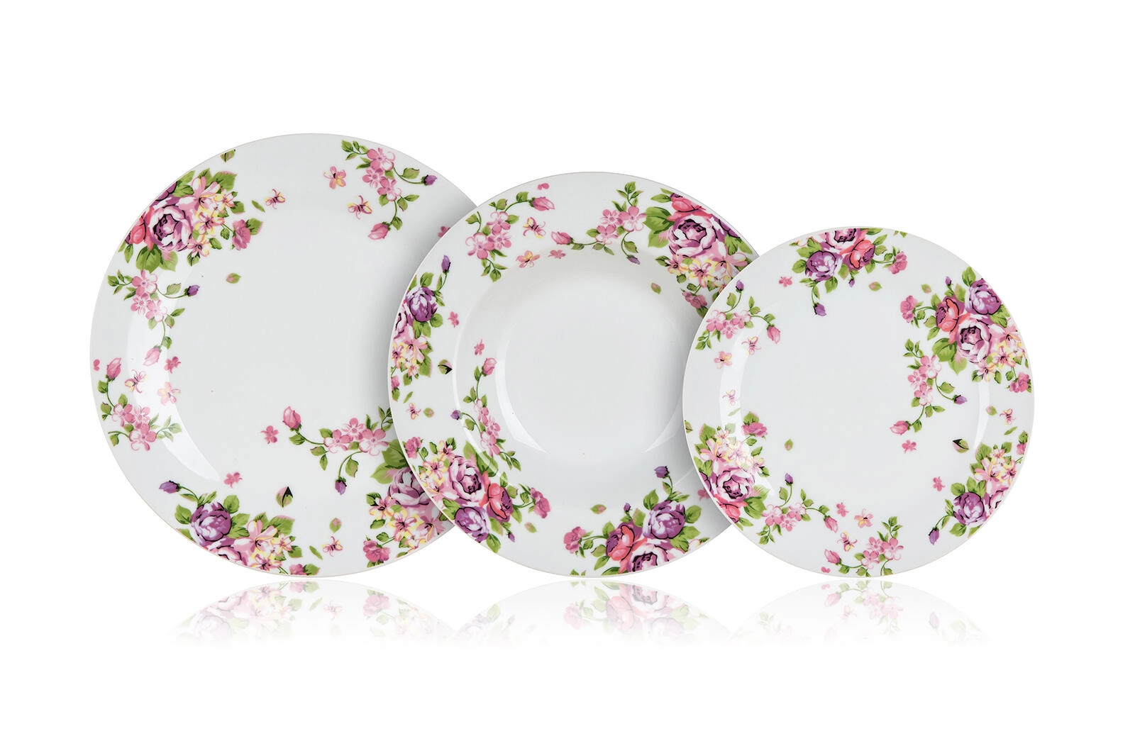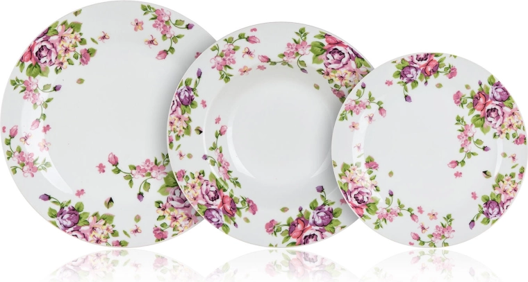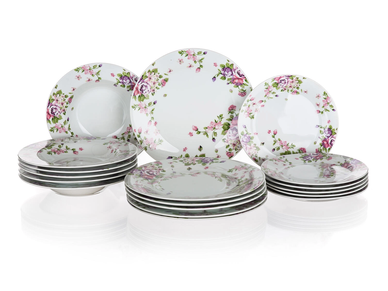 Elegant porcelænsspisestel Beauty med blomstermotiv, der bringer harmoni til hvert bord. Indeholder 18 dele til 6 personer: dessert-, flade og dybe tallerkener. Takket være kvalitetsporcelæn er det egnet til opvaskemaskine og mikrobølgeovn, har en blank glasur og et ensartet design til stilfuld borddækning i hverdagen og ved festlige lejligheder.