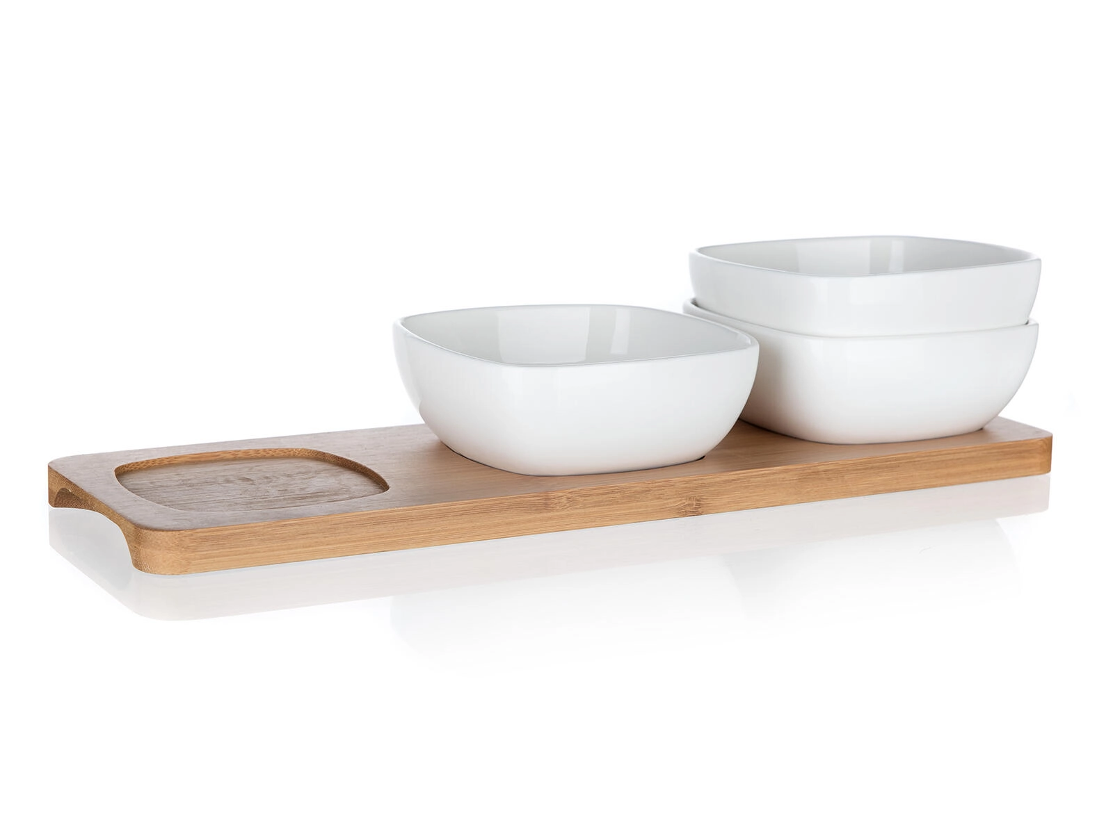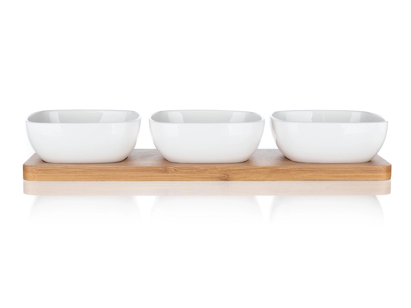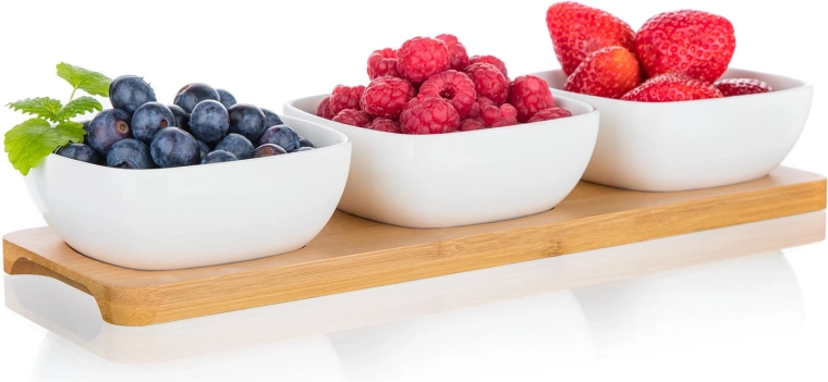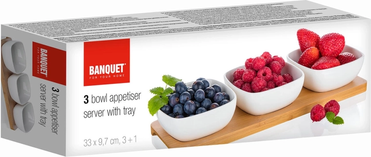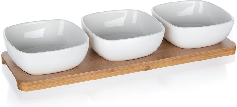 Dette kompakte sæt med tre firkantede skåle af kvalitetsporcelæn på en solid bambusbakke tilbyder en praktisk og æstetisk løsning til både hverdag og fest. Blankt porcelæn fremhæver farverne på de serverede lækkerier, og naturlig bambus giver serveringen en varm, moderne accent.