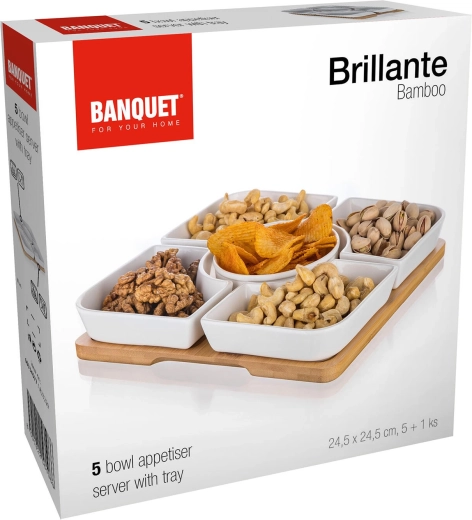 Det elegante serveringssæt BRILLANTE kombinerer kvalitetsporcelæn og naturlig bambus til stilfuld servering af snacks. Det seksdelte sæt med fem skåle og et fad i målene 24,5 × 24,5 × 4,5 cm er perfekt til nødder, oliven, tørret frugt eller dip-saucer. Det er let at bære, nemt at vedligeholde og giver en overskuelig, organiseret servering til enhver lejlighed.