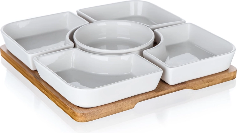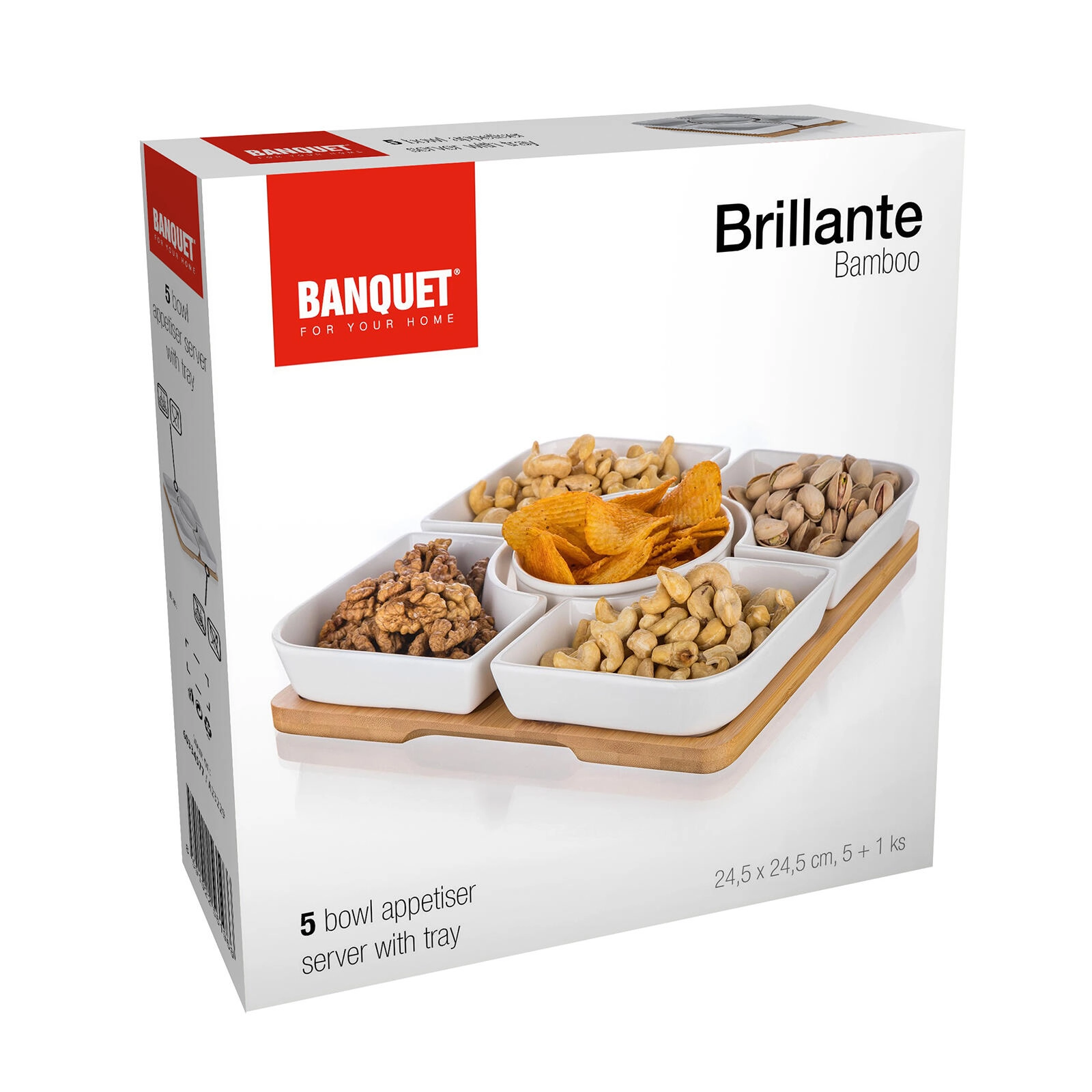 Løft din borddækning med det praktiske og designede serveringssæt BRILLANTE. Fem hvide porcelænsskåle (fire kantede og én rund i midten) er placeret på en solid bambusbakke. Sættet giver en overskuelig opdeling af snacks og passer perfekt til familiefester, aftener med venner og daglig servering.