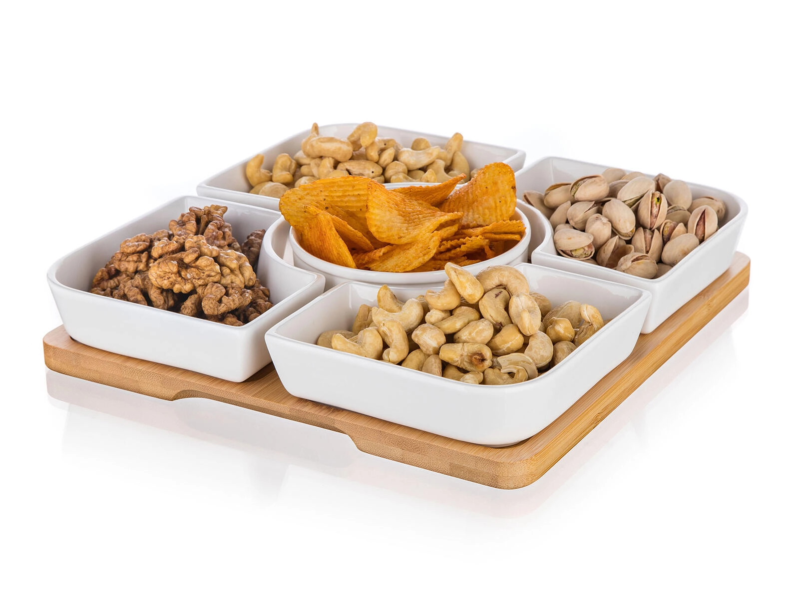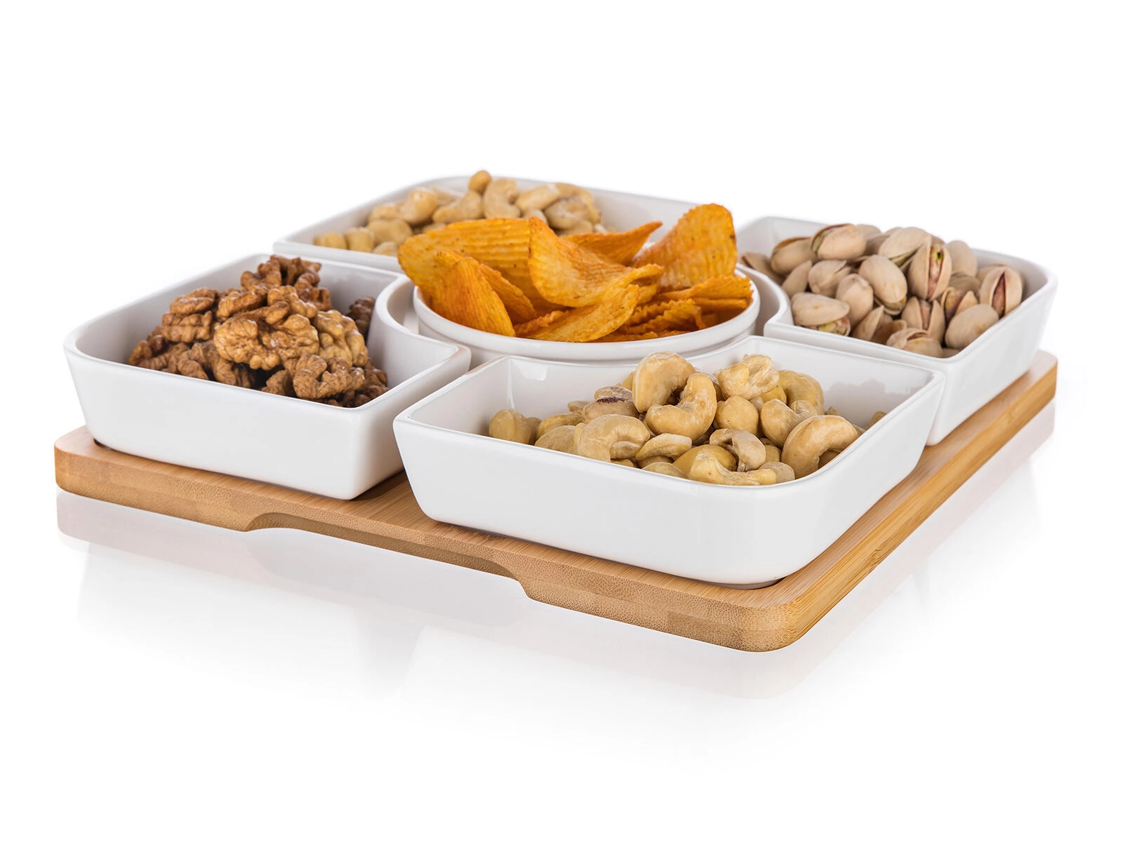 Fire kvadratiske skåle og en central rund skål på en bambusbakke sikrer en overskuelig opdeling af snacks og en indbydende præsentation på bordet.