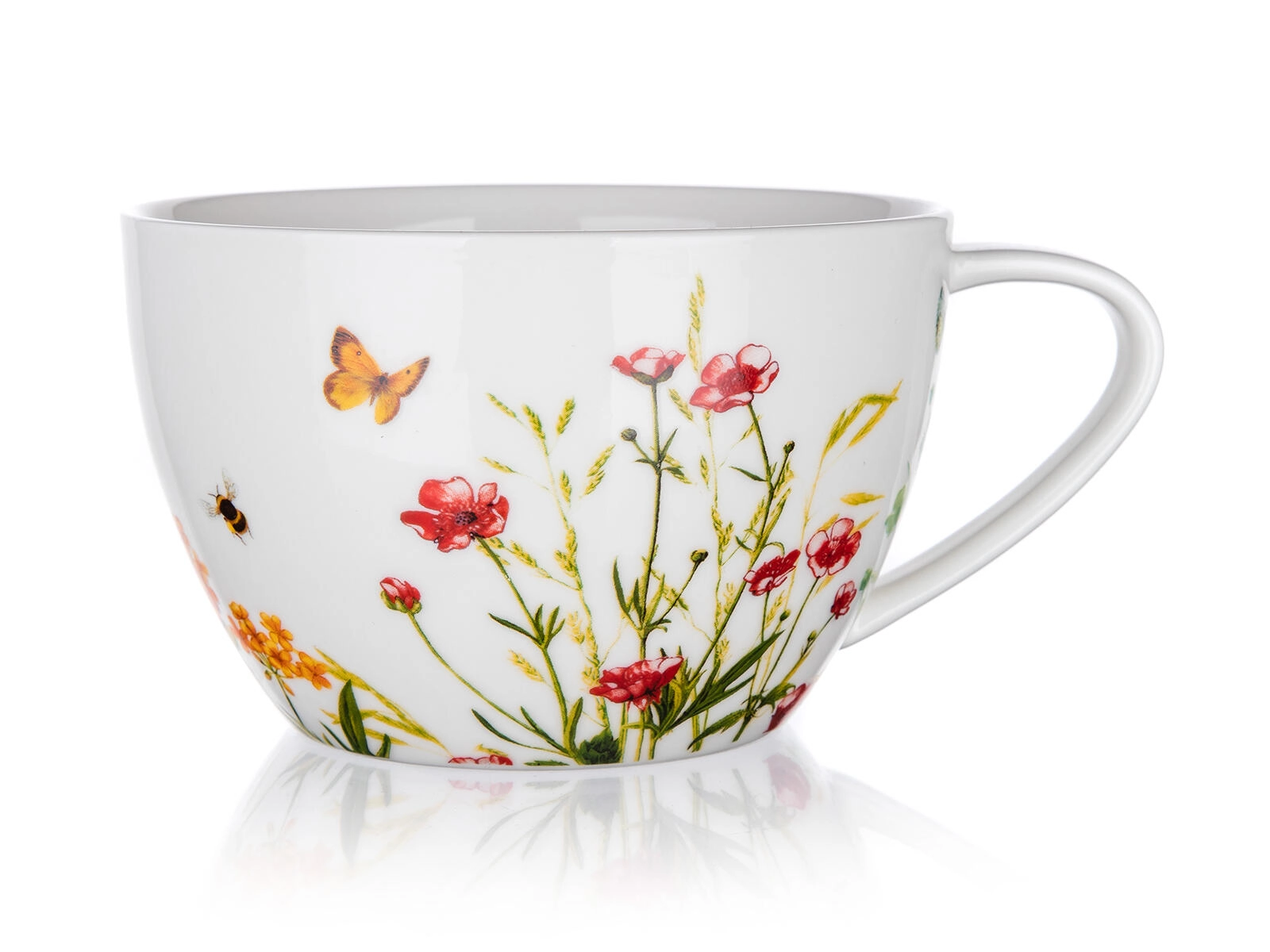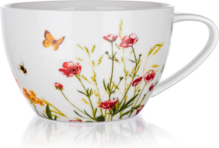 Det store keramiske Jumbo Meadow-krus (550 ml) er ideelt til hverdagens hyggestunder. Det naturlige blomstermotiv med sommerfugl og bi giver serveringen en unik charme og kan nemt kombineres med andre dele i samme dekoration.