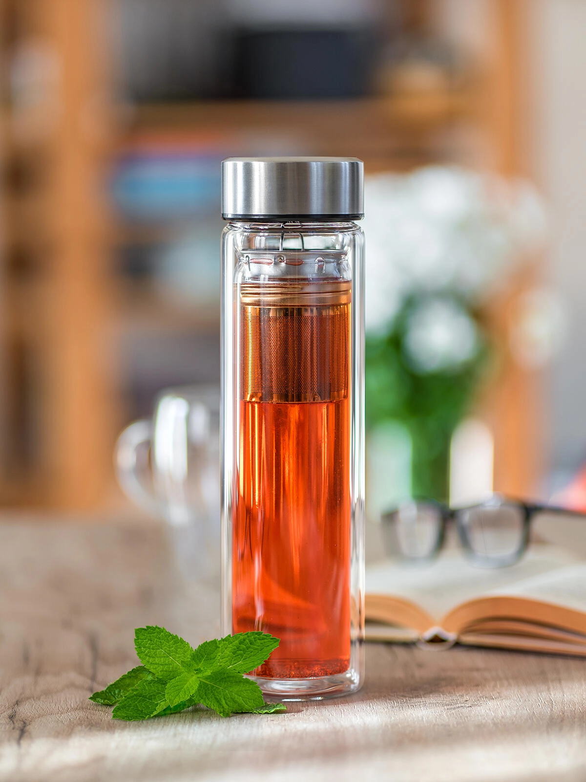 Medfølger er en aftagelig fin si i rustfrit stål, der gør det nemt at trække løste eller tilberede infusioner med urter og frugt direkte i flasken. Låg i rustfrit stål 18/8 sikrer hygiejne, holdbarhed og en sikker lukning. Det rene, moderne design i klart glas fremhæver desuden drikkens farve.