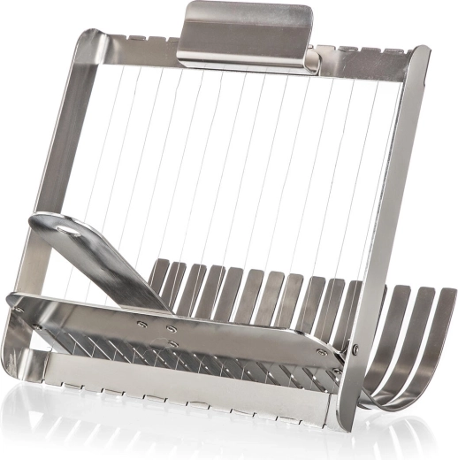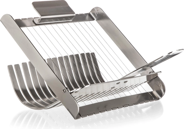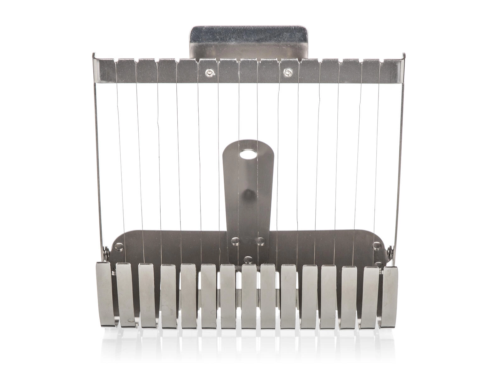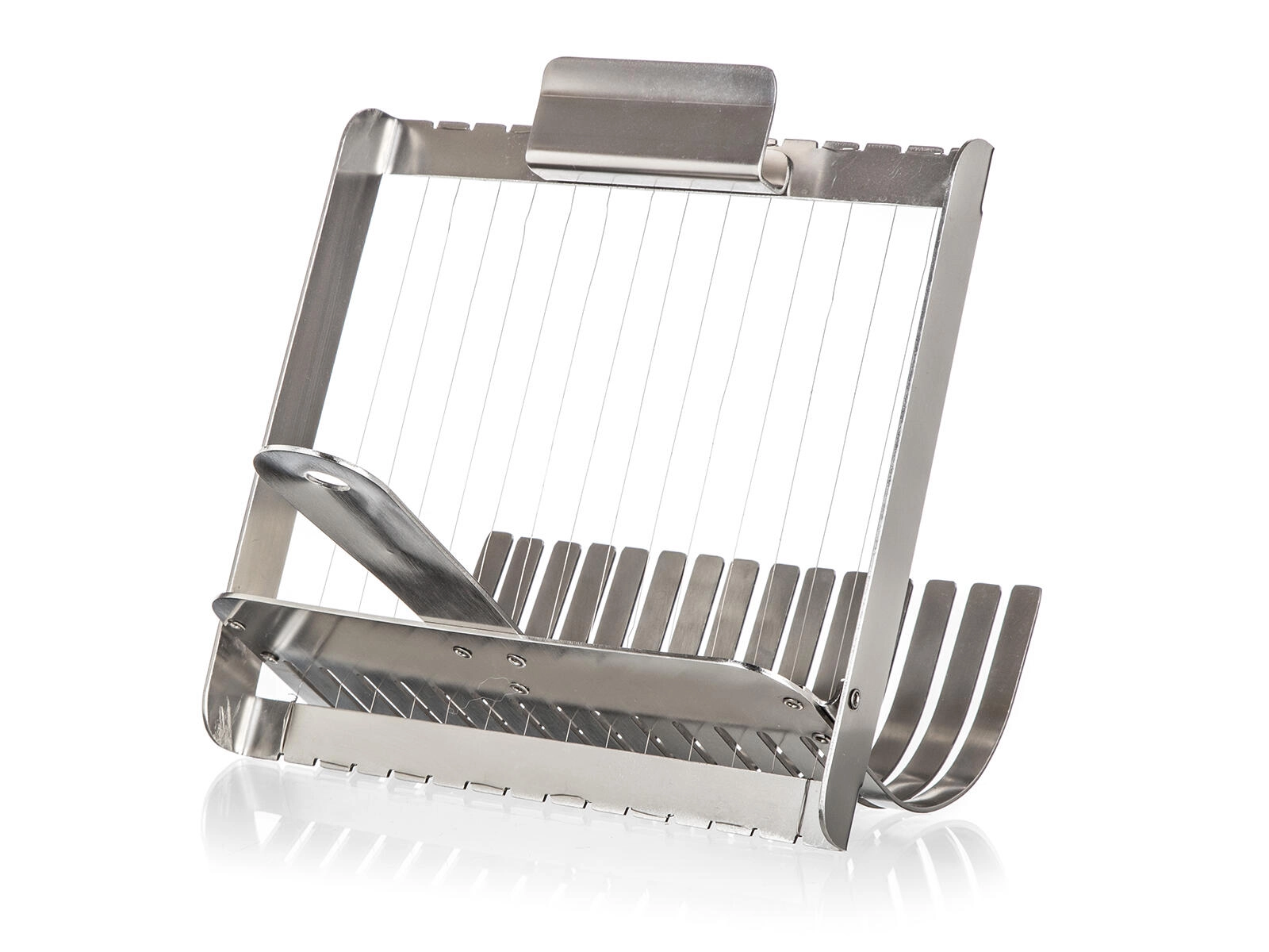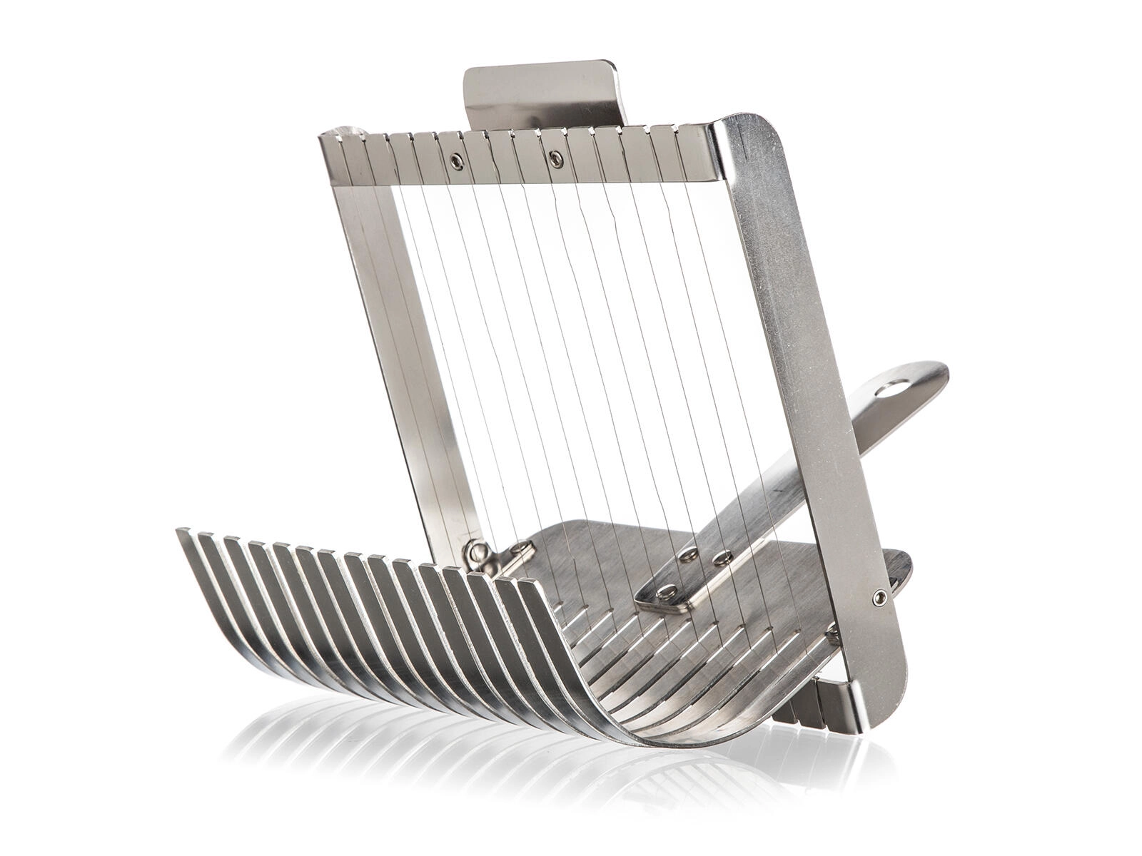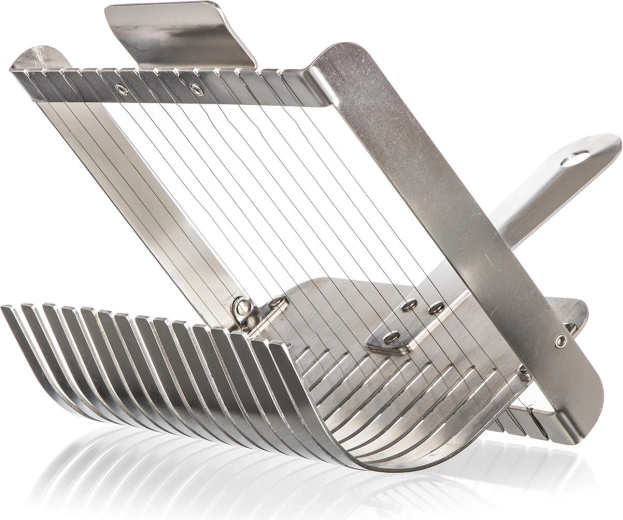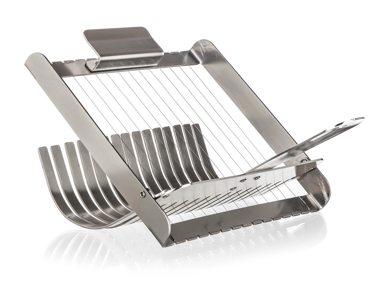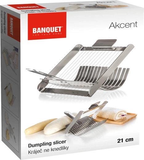 En pålidelig hjælper til hver dag – AKCENT trådskærer er designet til professionel og hjemmebrug. Den robuste konstruktion i rustfrit stål tåler hyppig brug, og trådene skærer rene, symmetriske skiver uden at klistre. Det ergonomiske design med løftespatel gør håndteringen af varme knödel hurtigere og øger både sikkerhed og komfort ved servering.