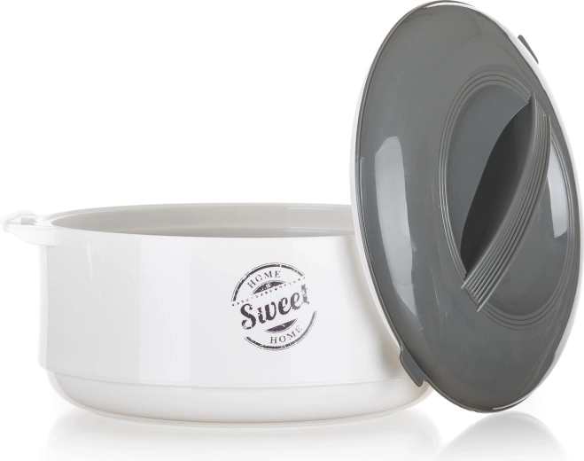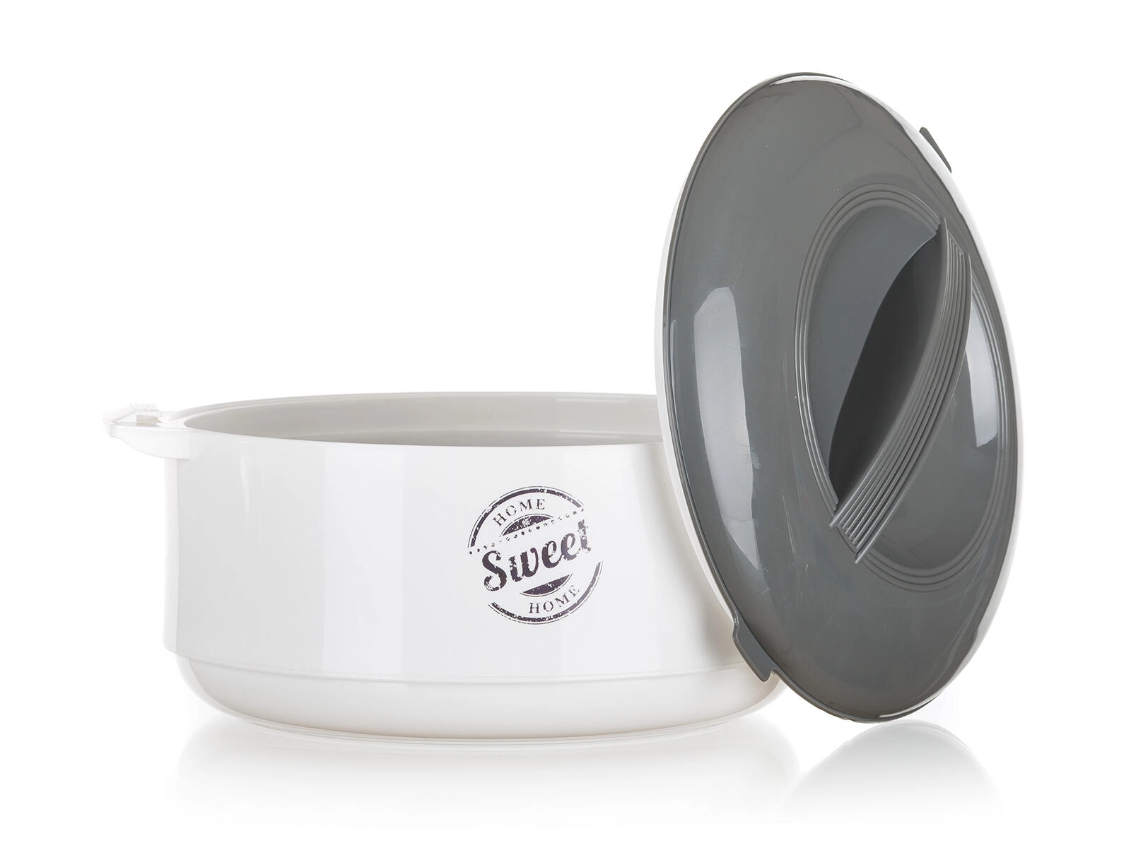 Praktisk termoskål med låg til langvarig opbevaring af varme og kolde retter. Takket være indsats i rustfrit stål og isolerende PUR-skum holder maden sig frisk længere, ideel til servering og transport. Elegant hvid-grå udførelse med SWEET HOME-dekor passer perfekt ind i ethvert køkken.