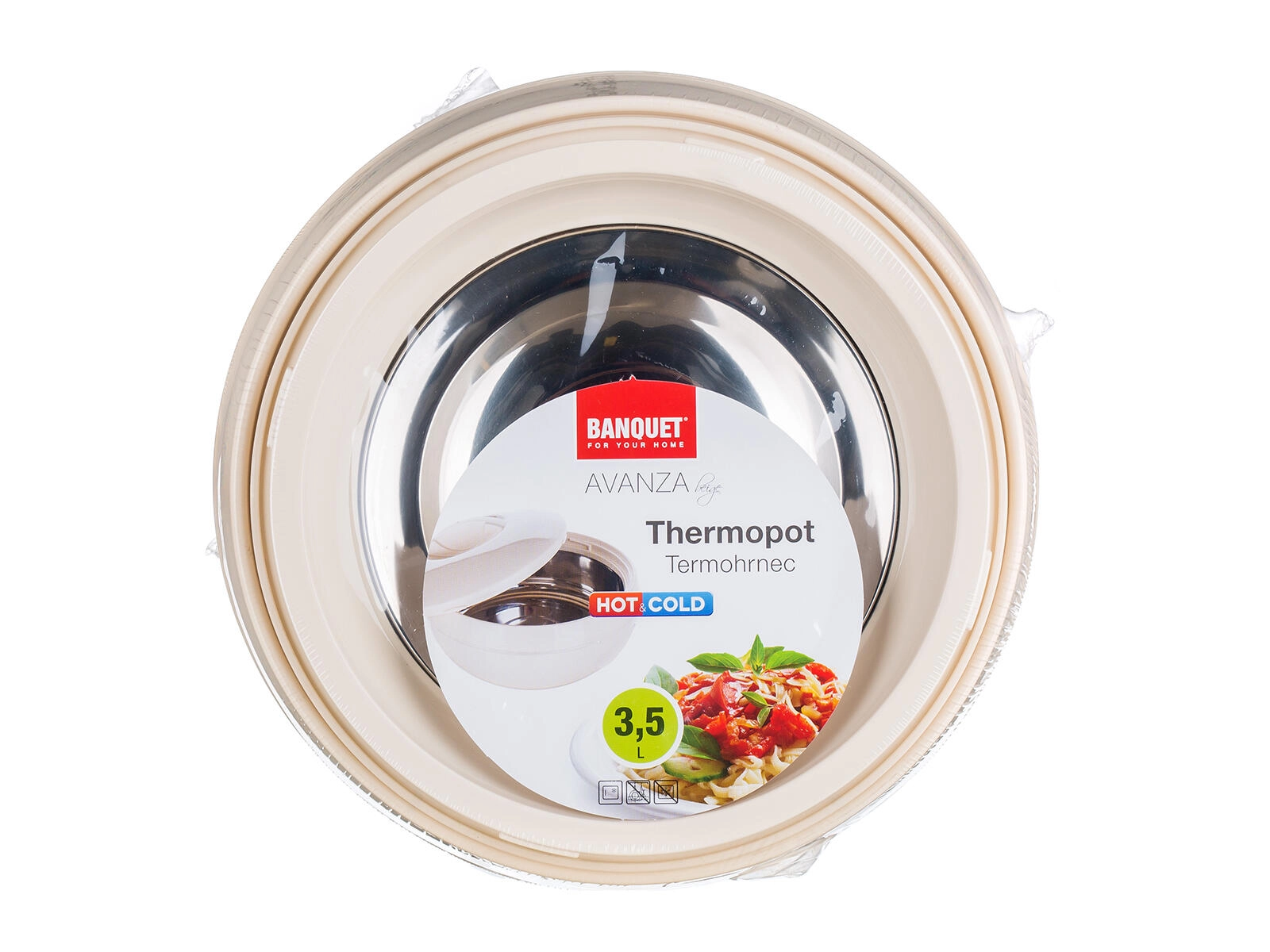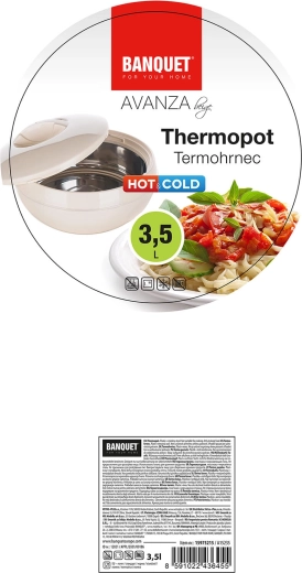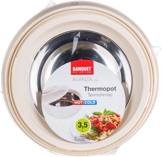 Den praktiske termoskål AVANZA med en kapacitet på 3,5 l i elegant beige holder dine retter varme eller kolde i længere tid. Takket være den rustfri stålindsats, isolerende PUR-skum og tætsluttende låg er den ideel til servering og transport af hjemmelavet mad.