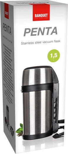 Den praktiske rustfri termoflaske PENTA med en kapacitet på 1,5 l holder dine drikke varme eller kolde i lang tid. Takket være dobbeltvægget konstruktion, holdbart rustfrit stål, et behageligt håndtag og justerbar skulderrem er den ideel til rejser, vandreture og arbejde. Låget fungerer som kop, og den sikre plastlukkemekanisme gør det nemt at hælde uden risiko for skoldning.