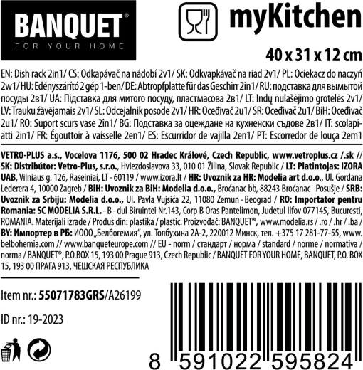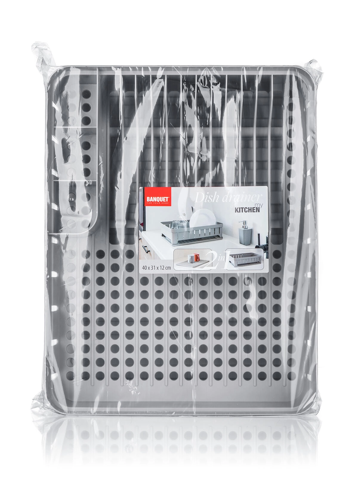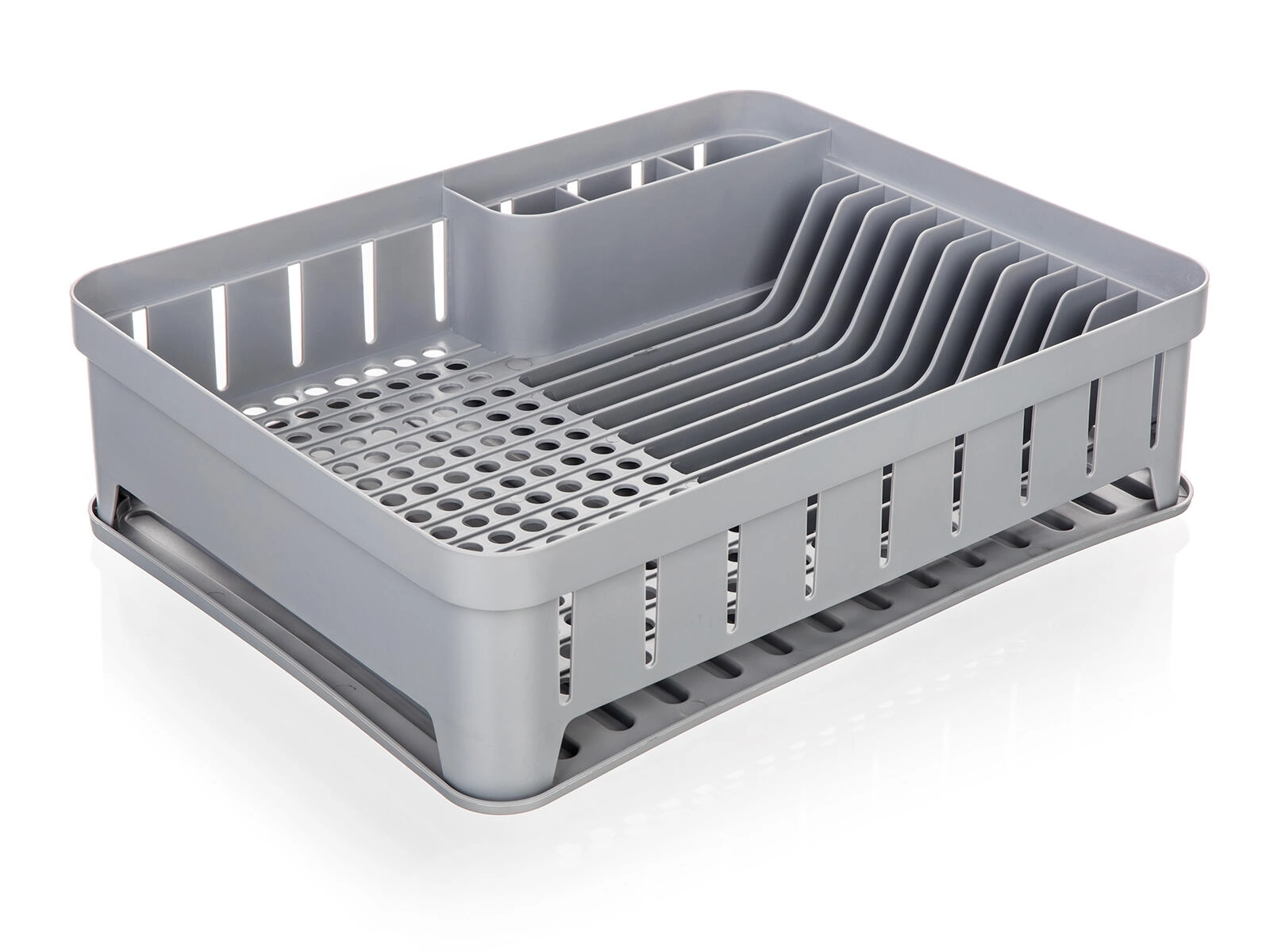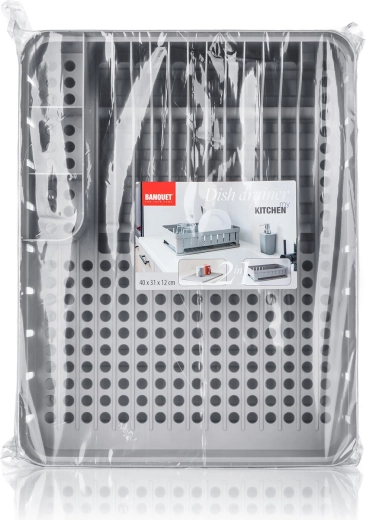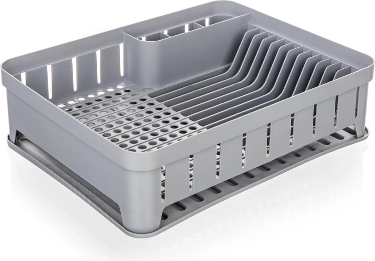 Praktisk opvaskestativ med bakke i grå farve med mål 40 × 31 × 12 cm, som giver rigelig plads til daglig opvask. Det har separerede sektioner til bestik, tallerkener og andet service, hvilket gør tørringen overskuelig og hurtig. Holdbar plast er let at rengøre, og bakken opsamler dryppende vand, så køkkenbordet forbliver rent og tørt.