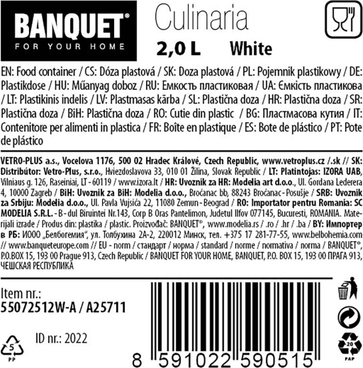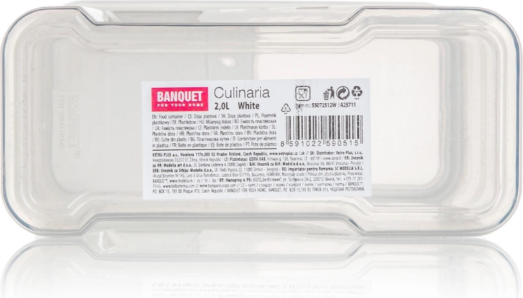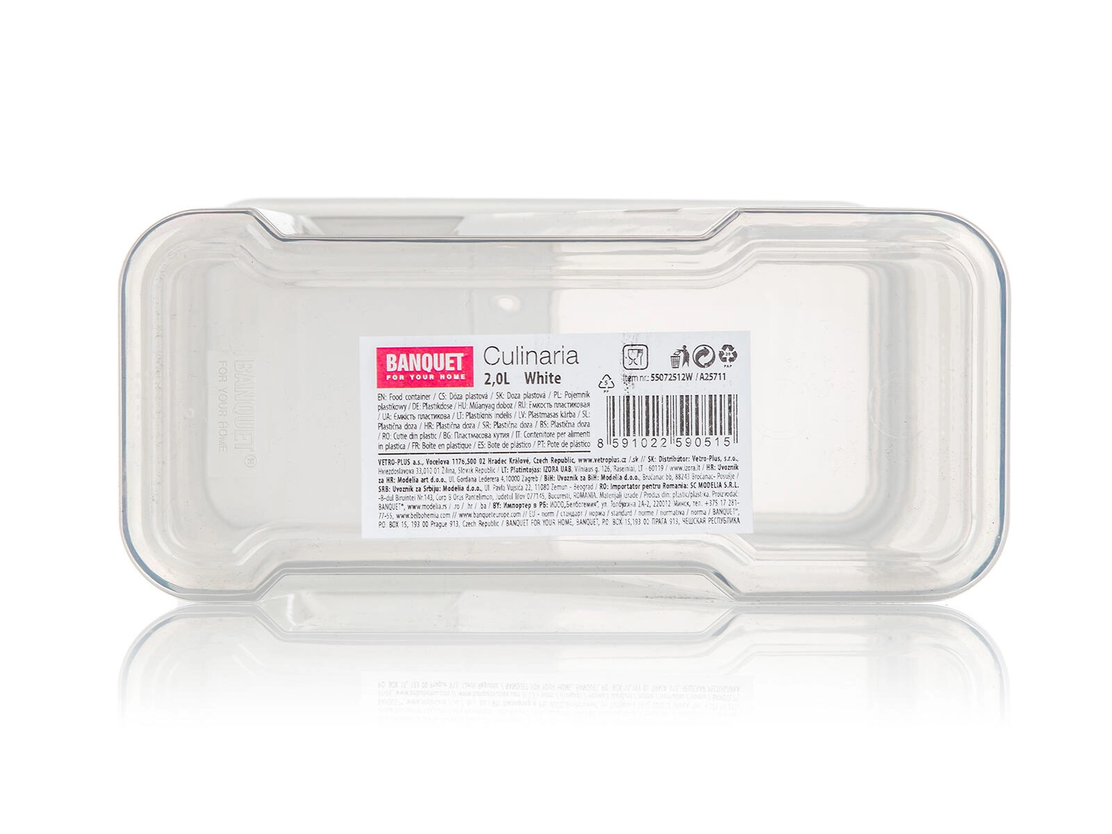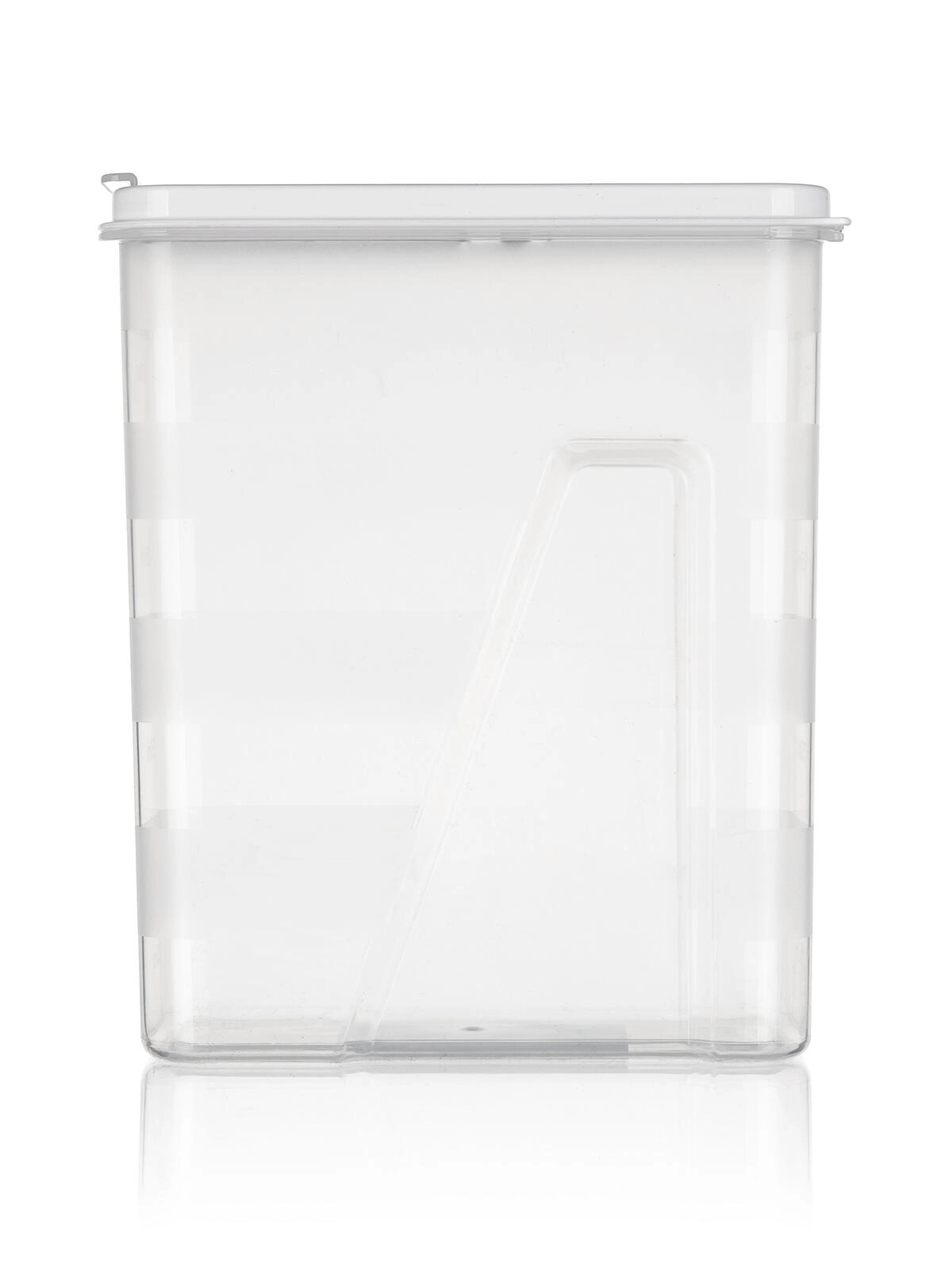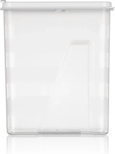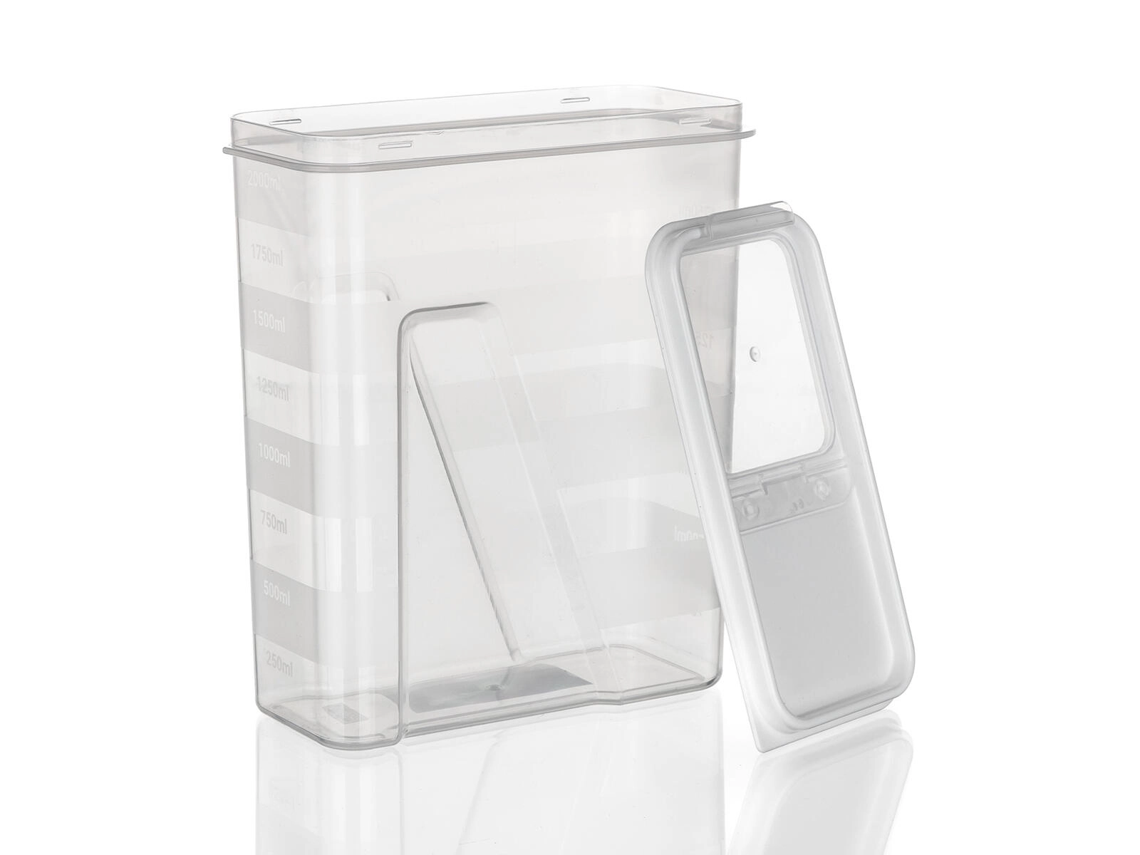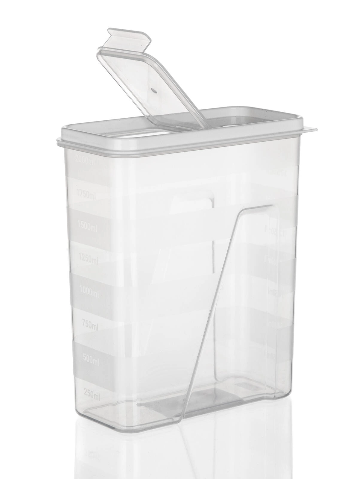 Denne rummelige 2-liters beholder er ideel til daglig organisering af spisekammeret. De gennemsigtige vægge giver hurtig visuel kontrol af indholdet, mens det hvide låg med praktisk åbning sikrer, at maden holder sig frisk længere og beskyttet mod fugt.