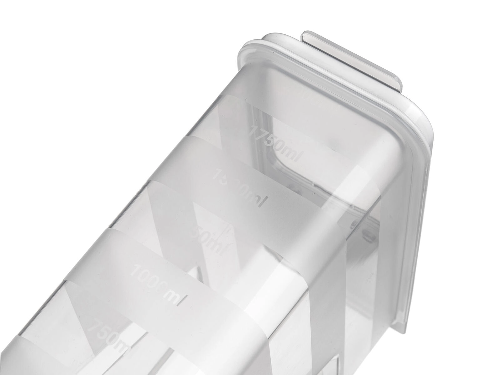 Integreret måleskala med 250 ml-trin gør præcis dosering og beholdningskontrol nem. Beholderen er velegnet til opbevaring af pasta, bælgfrugter, ris, mel, sukker og andre tørvarer. Takket være den kompakte rektangulære form passer den godt på hylder og kombineres nemt med andre organisere.