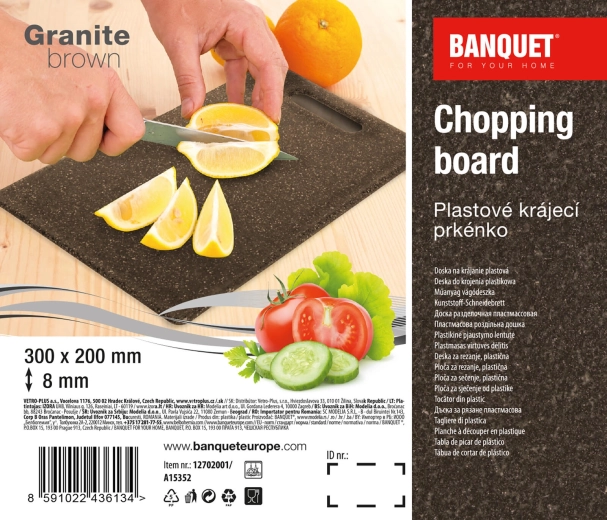 Det holdbare skærebræt GRANITE i størrelsen 30 × 20 cm er ideelt til daglig brug i køkkenet. Det tilbyder en solid og knivvenlig overflade, nem vedligeholdelse og et praktisk ophængsøje. Velegnet til stål- og keramiske knive og kan tåle opvaskemaskine.
