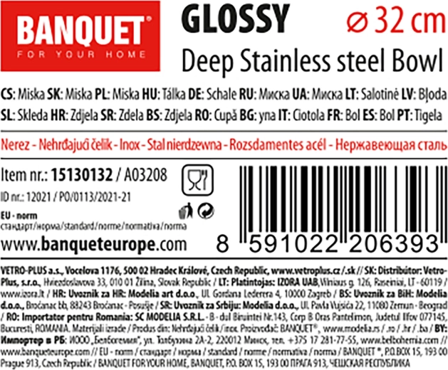 Praktisk og holdbar rustfri stålskål Glossy med en diameter på 32 cm er ideel til daglig madlavning og bagning. Den er dyb, hygiejnisk og nem at rengøre – den tåler opvaskemaskine. Den tyndvæggede konstruktion med en tykkelse på 0,3 mm gør den let at håndtere.