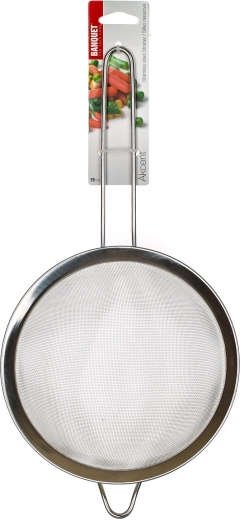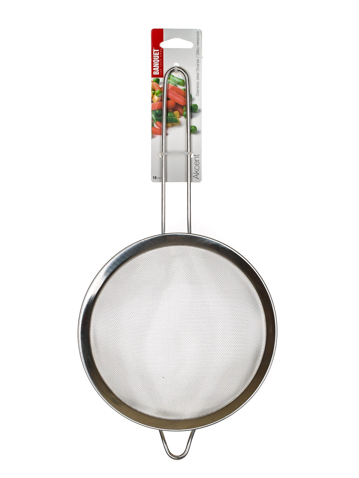 Praktisk køkkensi med en diameter på 19 cm i kvalitets rustfrit stål AKCENT til daglig brug. Ideel til sining af væsker og drikke, med et komfortabelt metalhåndtag med ophængsøje. Finmasket net med 20 masker pr. cm2 og trådtykkelse 0,28 mm sikrer præcis filtrering og lang levetid.