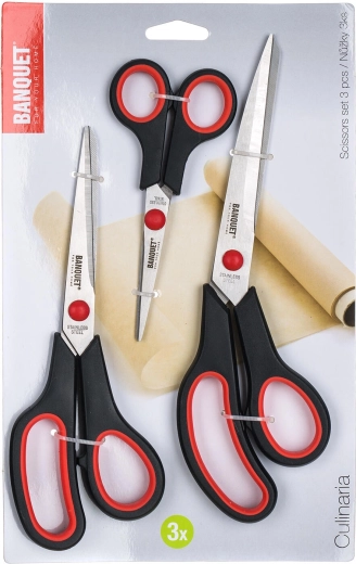 Dette praktiske sæt med sakse giver alsidig anvendelse til daglig klipning i hjemmet, på kontoret og i værkstedet. To større og én mindre saks dækker et bredt spektrum af opgaver – fra præcis klipning af papir til tilpasning af tekstiler eller emballagematerialer. De kvalitetsstålsklinger kan nemt slibes igen, så saksene bevarer skarpheden selv ved regelmæssig brug.