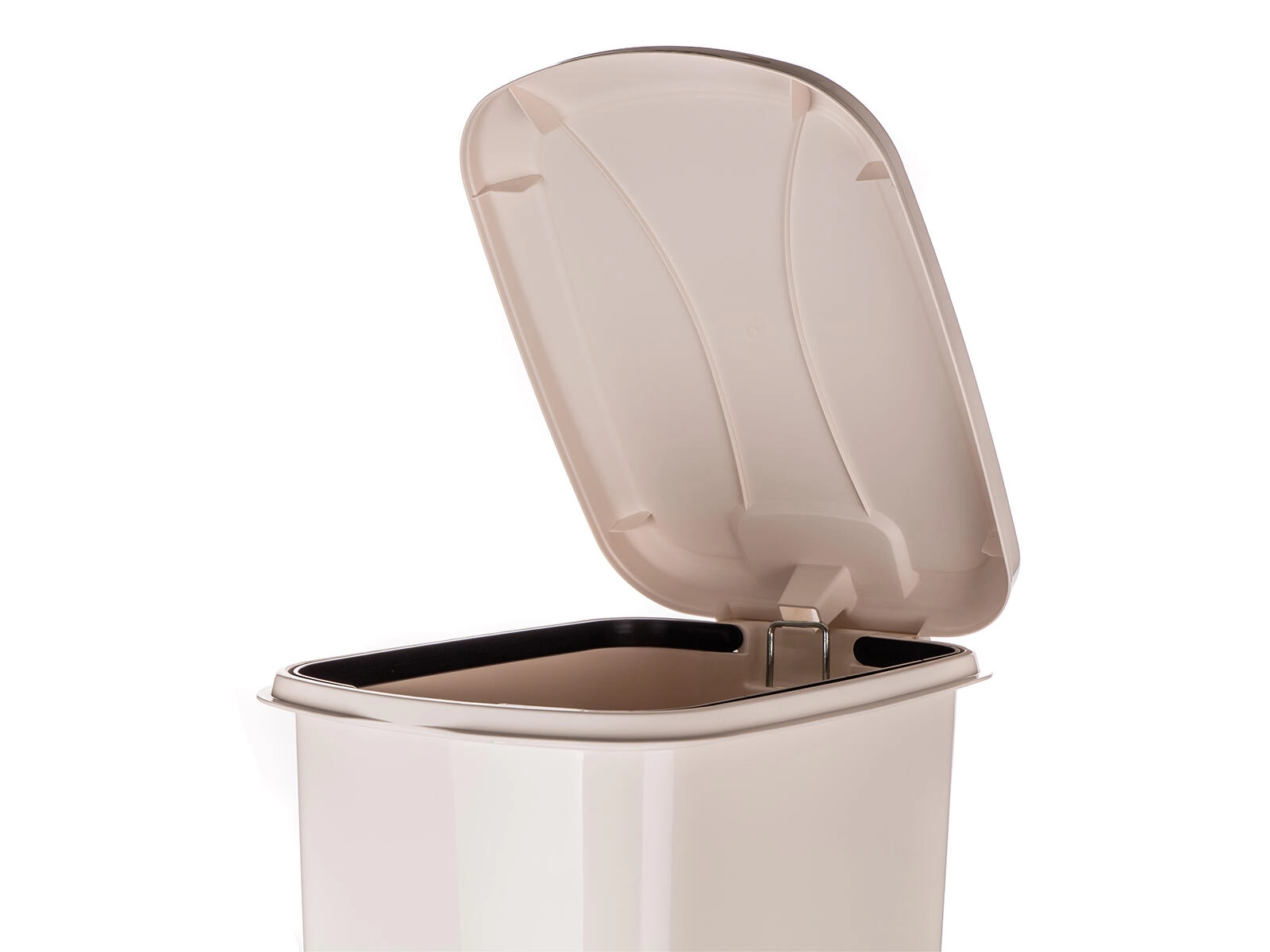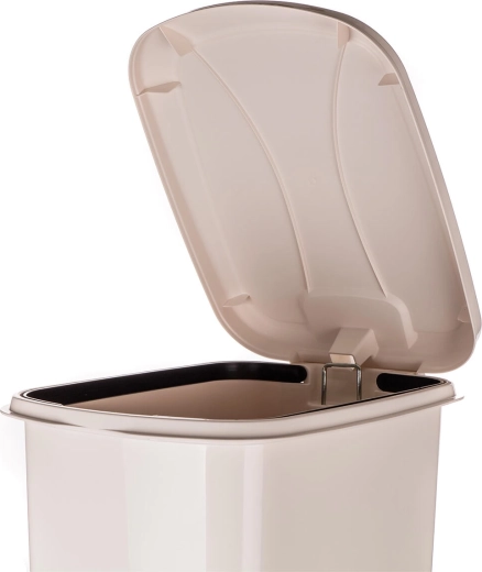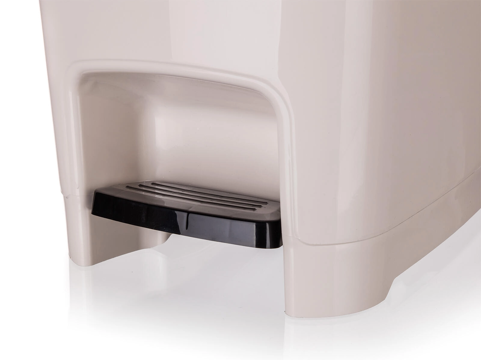 Praktisk affaldsspand med pedalmekanisme, der sikrer ren og bekvem betjening uden håndkontakt. Den rektangulære form sparer plads langs væggen eller køkkenbordet, og den cremefarvede udførelse passer nemt ind i det moderne hjem.