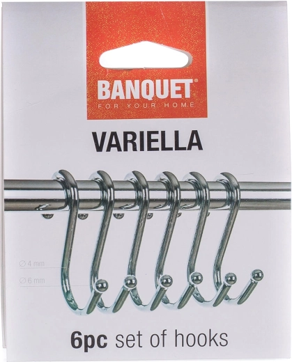 Sættet med 6 kvalitets S‑kroge VARIELLA i forkromet jern er en fremragende løsning til organisering i køkken, spisekammer, badeværelse og værksted. Den glatte kromoverflade er nem at rengøre, og de afrundede ender beskytter de ophængte genstande mod ridser og hængen.