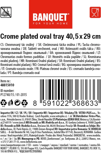 Den elegante ovale AKCENT-bakke i størrelsen 40,5 × 29 cm er fremstillet af forkromet metal og prydet med dekorativ gravering. Takket være den blanke overflade og den robuste udførelse er den perfekt til stilfuld servering af drikkevarer, desserter og forretter både derhjemme og i gastronomien.