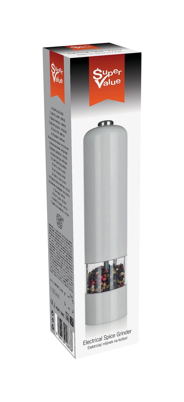 Den elektriske krydderikværn SUPER VALUE er en praktisk hjælper i ethvert køkken og på spisebordet. Det minimalistiske design med gennemsigtig midtersektion passer til det moderne hjem, mens den keramiske kværnemekanisme pålideligt klarer peber, salt og andre krydderier uden uønsket slitage.