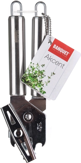 Praktisk AKCENT dåseåbner med klassisk vingemekanisme for hurtig og bekvem åbning. Den er fremstillet af kvalitetsrustfrit stål, tilbyder lang levetid og er altid lige ved hånden takket være ophængsøjet. Velegnet til professionel og privat brug.