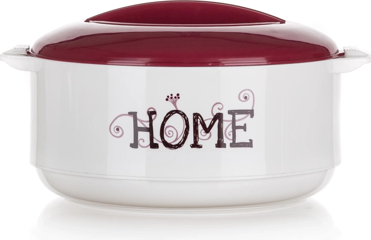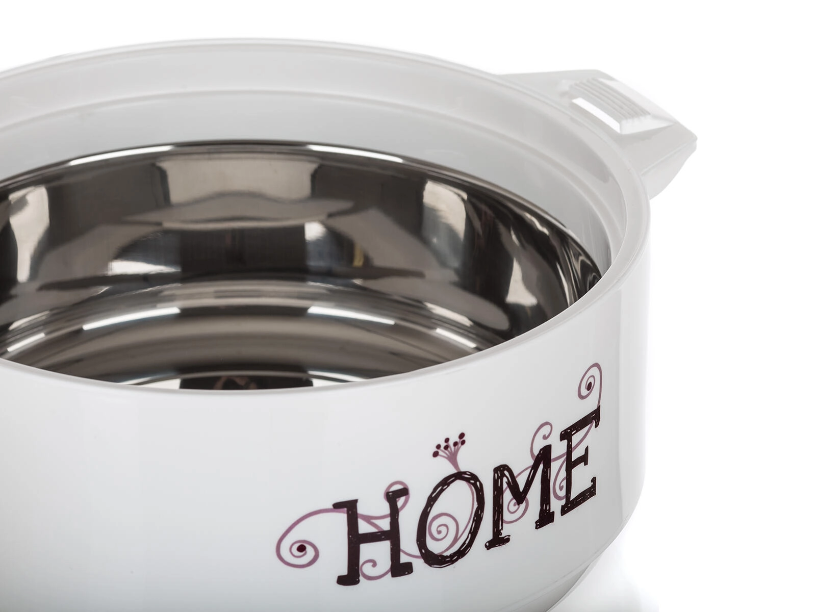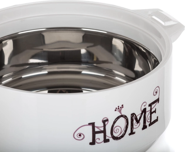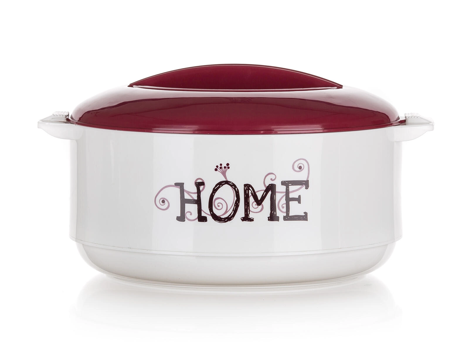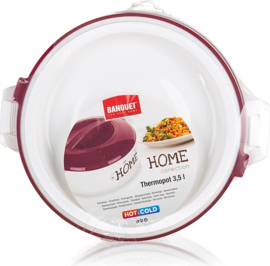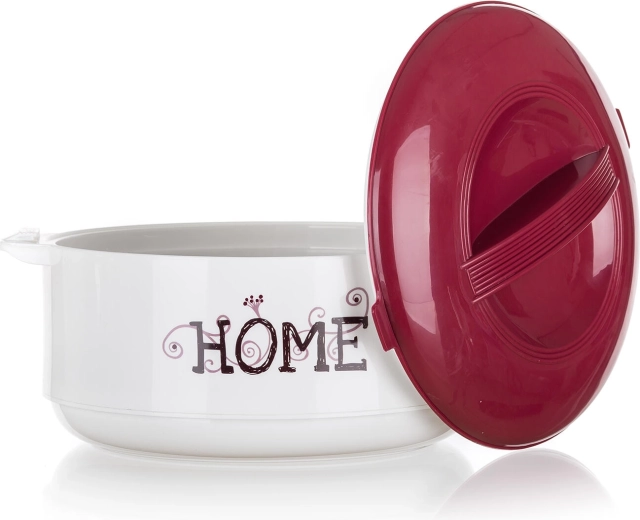 Termoskålen HOME 3,5 l i en elegant kombination af hvid og bordeaux er designet til bekvem opbevaring og servering af både varme og kolde retter. Takket være den indre indsats i rustfrit stål og PUR-skum mellem væggene holder den på temperaturen og er samtidig let at rengøre.