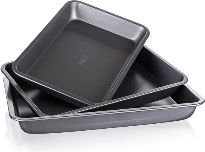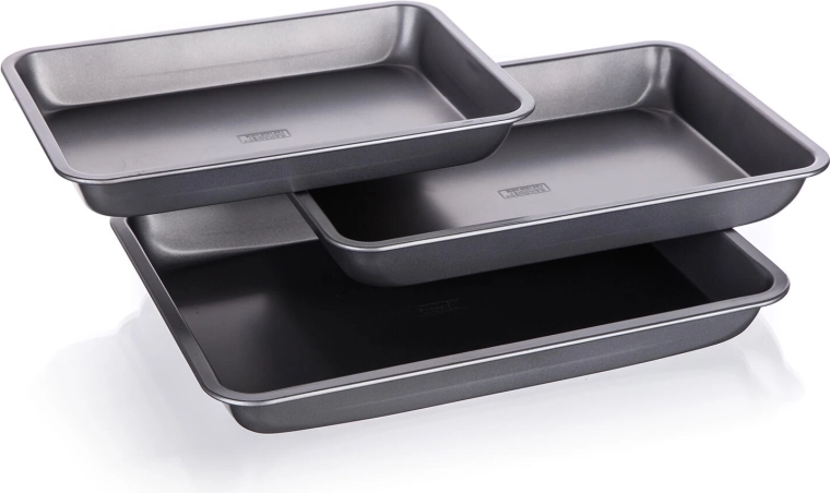 Dette 3-delte sæt bageplader Culinaria er et ideelt valg til ethvert køkken. Den non-stick XYNFLON-belægning baseret på PTFE sikrer førsteklasses anti-klæbeegenskaber – bagværk, grøntsager og kød slipper nemt, og pladerne rengøres hurtigt. Takket være tre forskellige størrelser vælger du let den plade, der passer præcist til din opskrift.