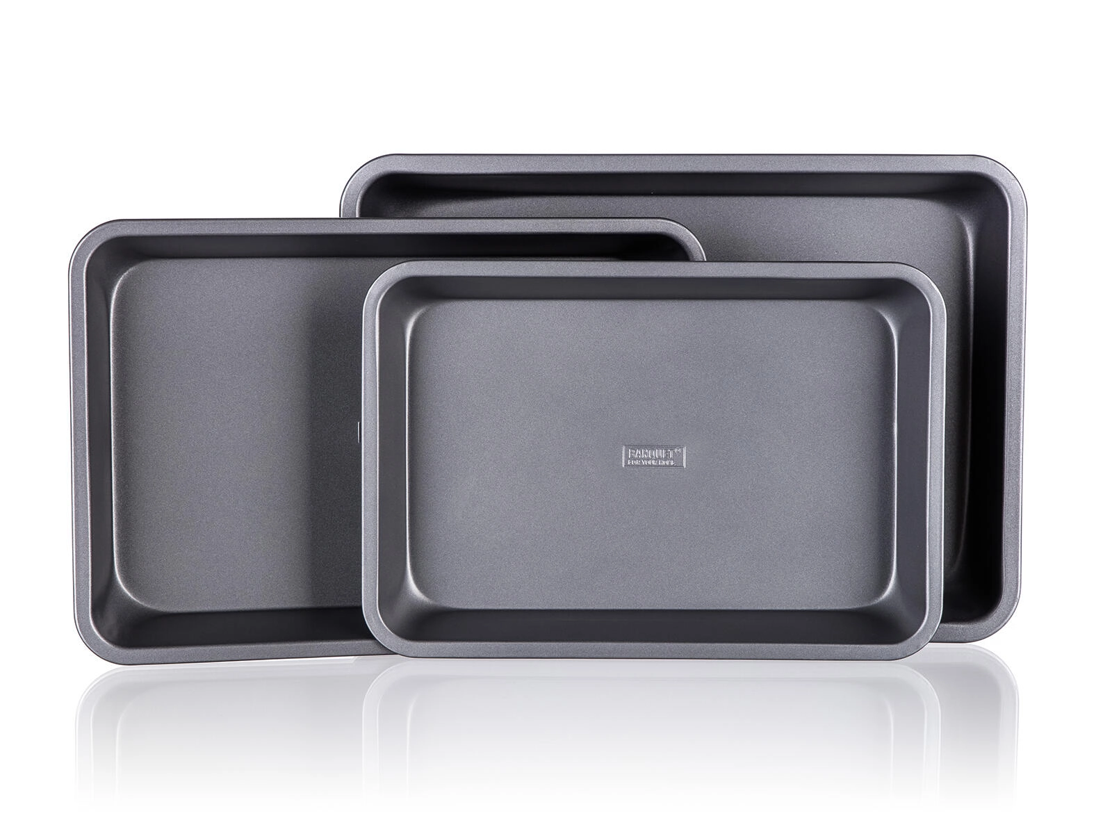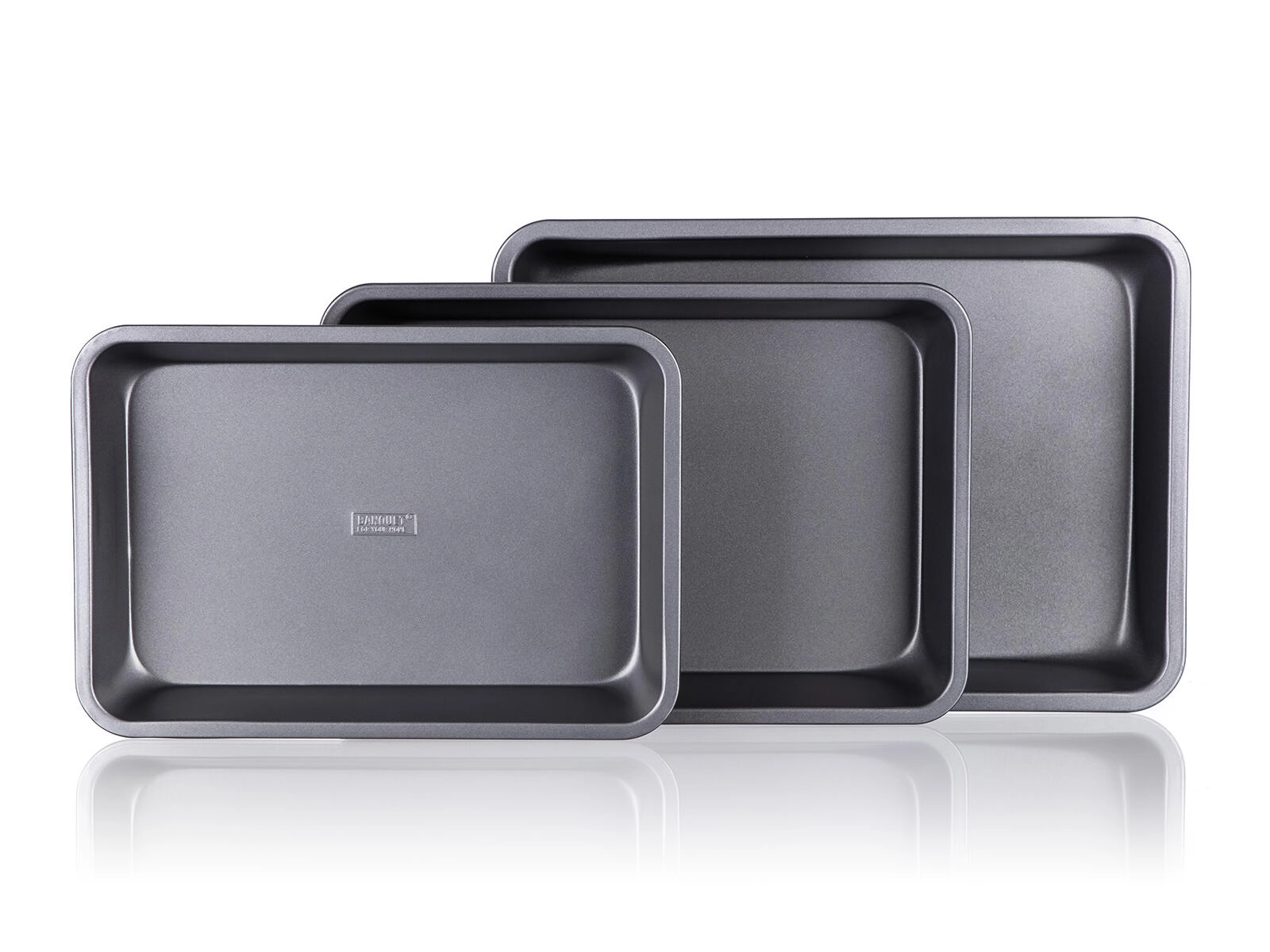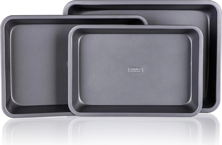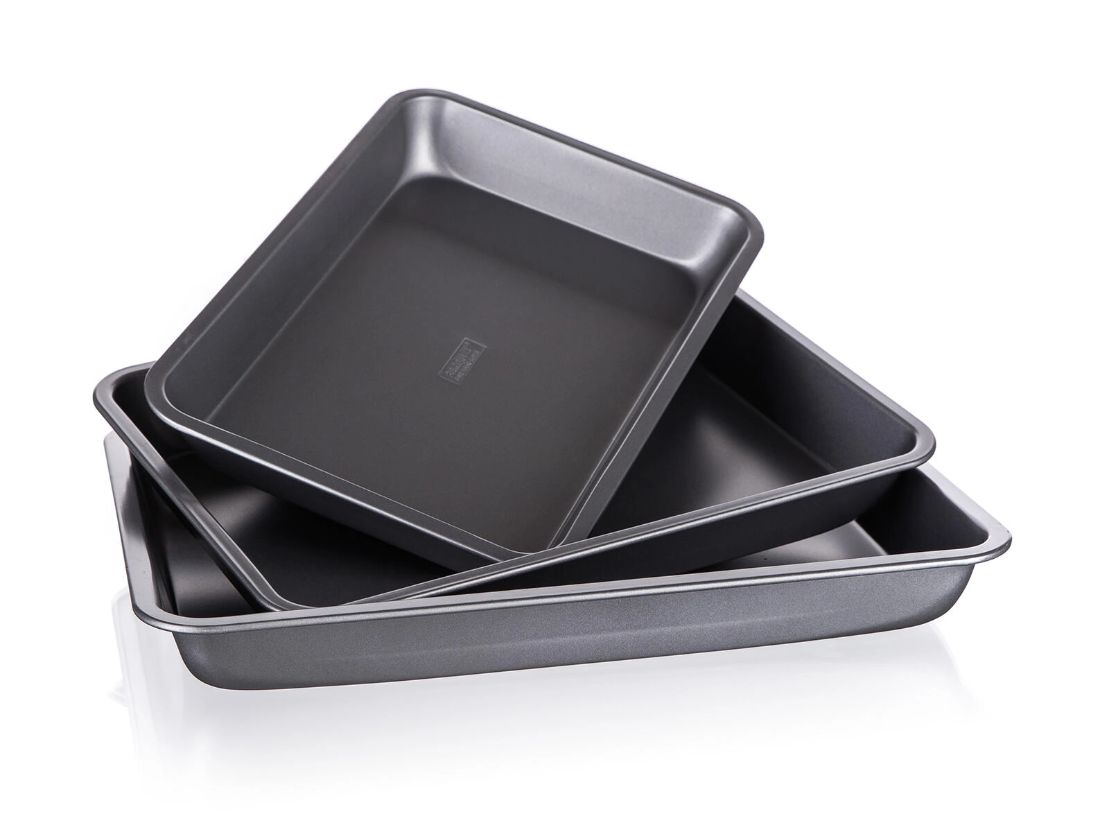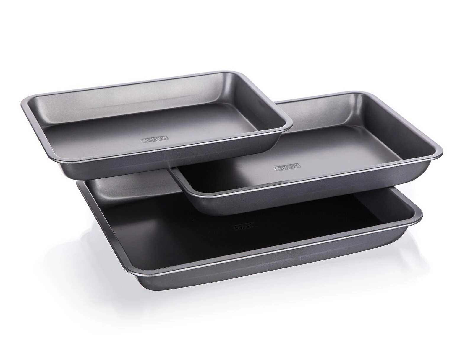 Pladerne af robust metal med 0,5 mm tykkelse og forhøjede kanter tåler daglig brug. Efter bagning skylles de blot af og opbevares pladsbesparende ved at sættes i hinanden.
