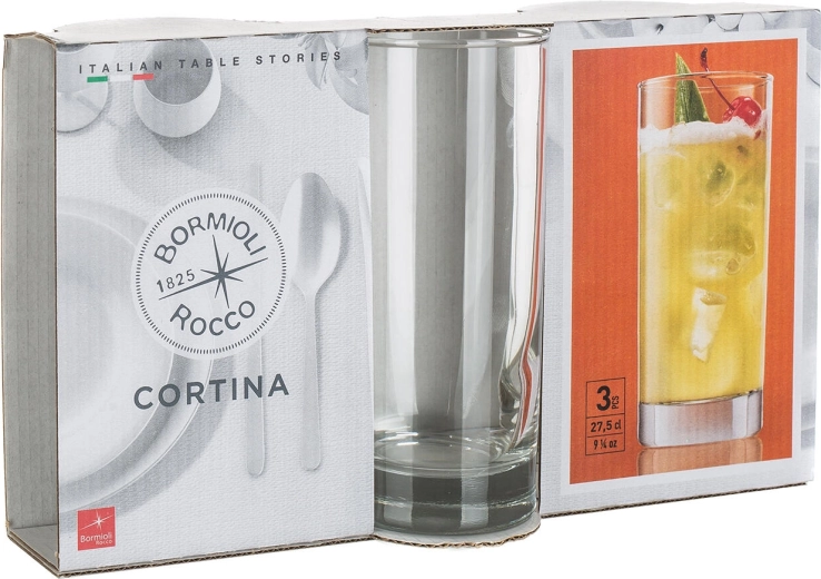 De alsidige glas Cortina 275 ml i et praktisk sæt med 3 stk. er ideelle til vand, juice og blandede drinks. Det klare design med massiv bund giver stabilitet, den elegante form er let at vedligeholde og fremhæver smukt drikkens farve.