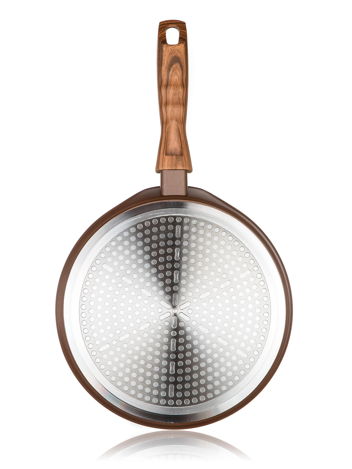 Takket være den induktionskompatible bund er panden egnet til alle typer komfurer – gas, el, glaskeramik og induktion. Den lave kant (1,6 cm) gør det lettere at vende pandekager, og den flade, brede overflade er ideel til jævn fordeling af dej. For maksimal bekvemmelighed kan panden vaskes i opvaskemaskine.