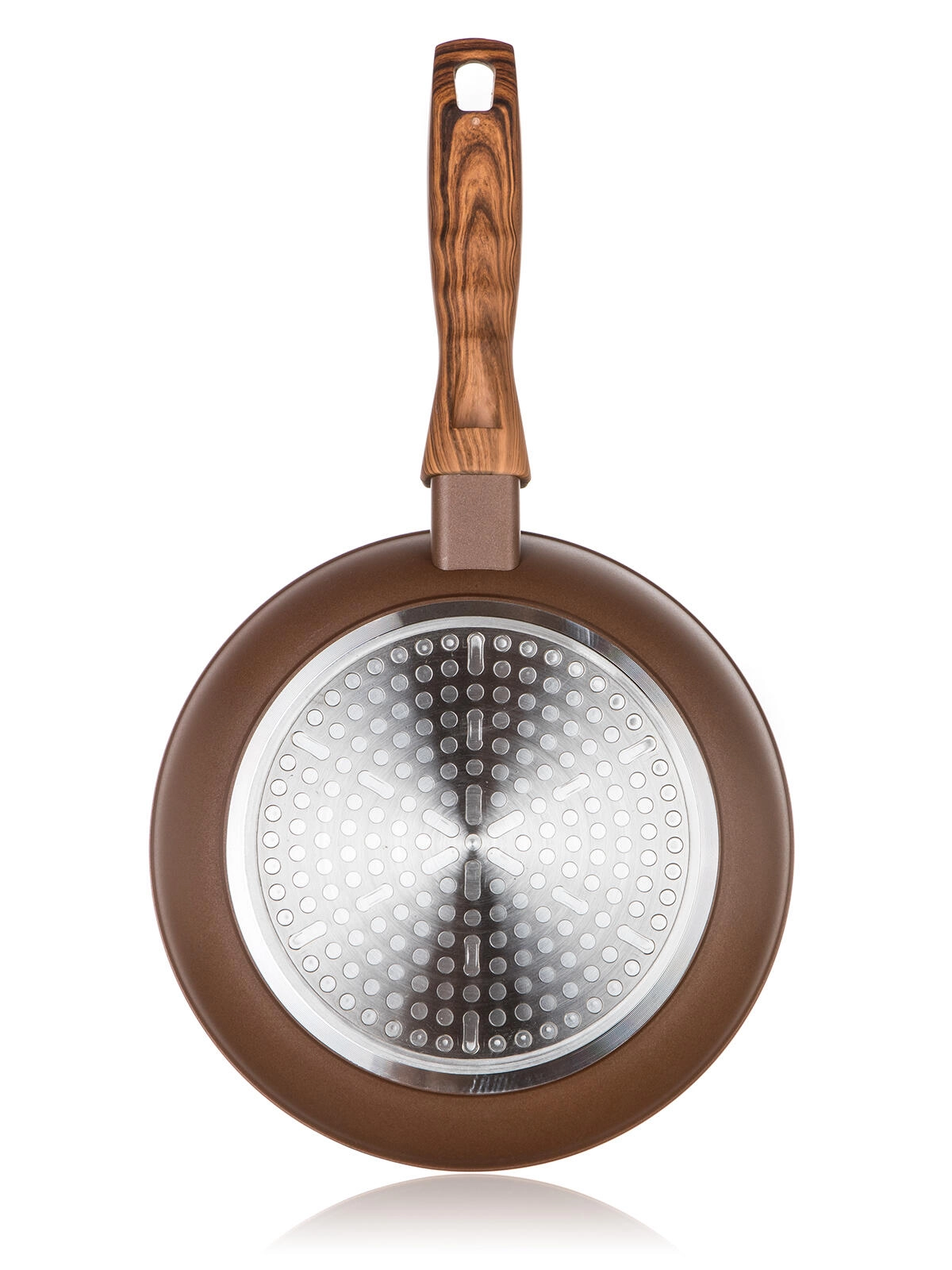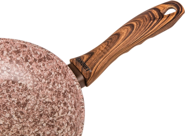 Takket være den fuldt induktionskompatible bund er panden kompatibel med alle kogeplader – el, gas, glaskeramik og induktion. Det ergonomiske bakelithåndtag med soft touch i træimitations-look ligger godt i hånden og forbliver køligt under madlavningen.