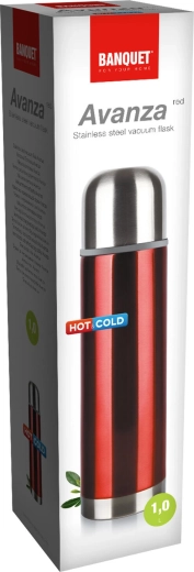 Den praktiske AVANZA-termoflaske i rustfrit stål med en kapacitet på 1 l holder dine drikke varme eller kolde i lang tid. Den tilbyder dobbeltvægget konstruktion, holdbart design i rustfrit stål og bekvem clip-åbning, der kan betjenes med én hånd. Den ydre metalrøde overflade giver stil, og låget fungerer som en drikkekop.