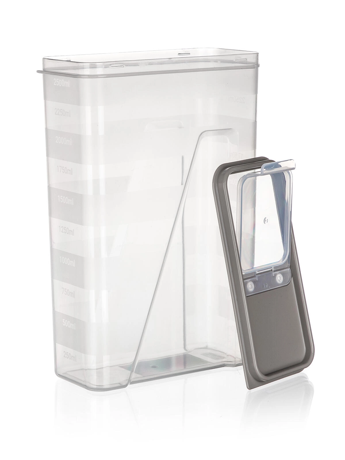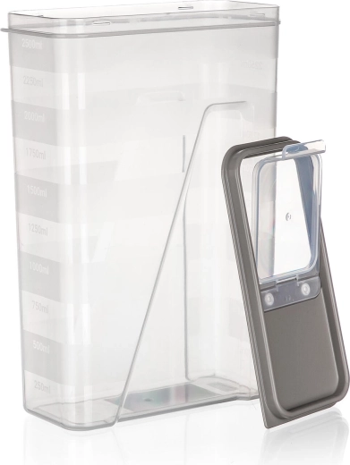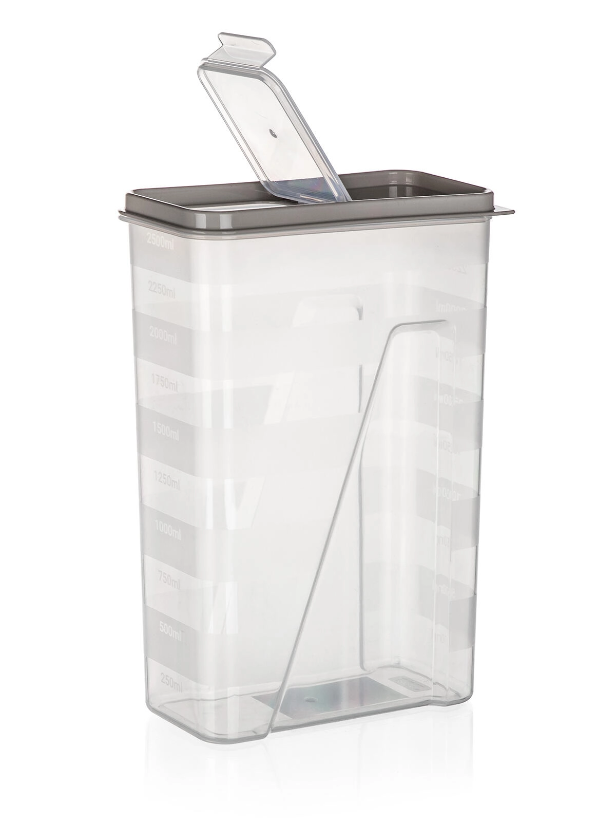 En praktisk og stilfuld beholder på 2,5 l holder dine tørre råvarer friske og overskueligt opbevaret. Takket være den gennemsigtige krop kan du altid se både indhold og mængde. Låget i latte-nuance åbnes let og giver præcis dosering. Integrerede målemarkeringer for hver 250 ml gør det nemt at holde styr på lageret og opskrifter. Ideel til pasta, bælgfrugter, mel, sukker og morgenmadsprodukter.